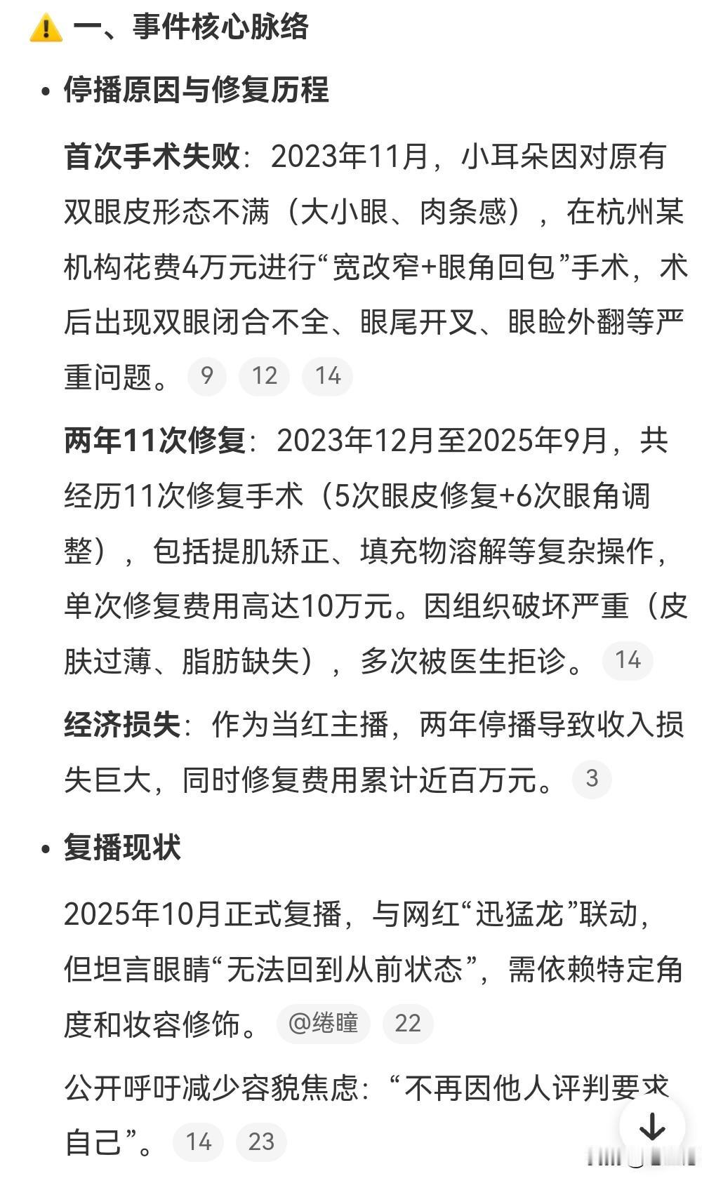 容貌焦虑实在是太可怕,有一个叫小耳朵的网红,做了双眼皮手术,结果给做坏了。 这导致她停播了两年,期间做了修复双眼皮11次。 她总觉得不完美,一直修复了11次。 最终做的效果还不错。她回归了,这个主播本来是属于高颜值,没想到之前有容貌焦虑。 不过从这件事情也敲响了警钟。 那就是不要太追求完美,以免遇到庸医。