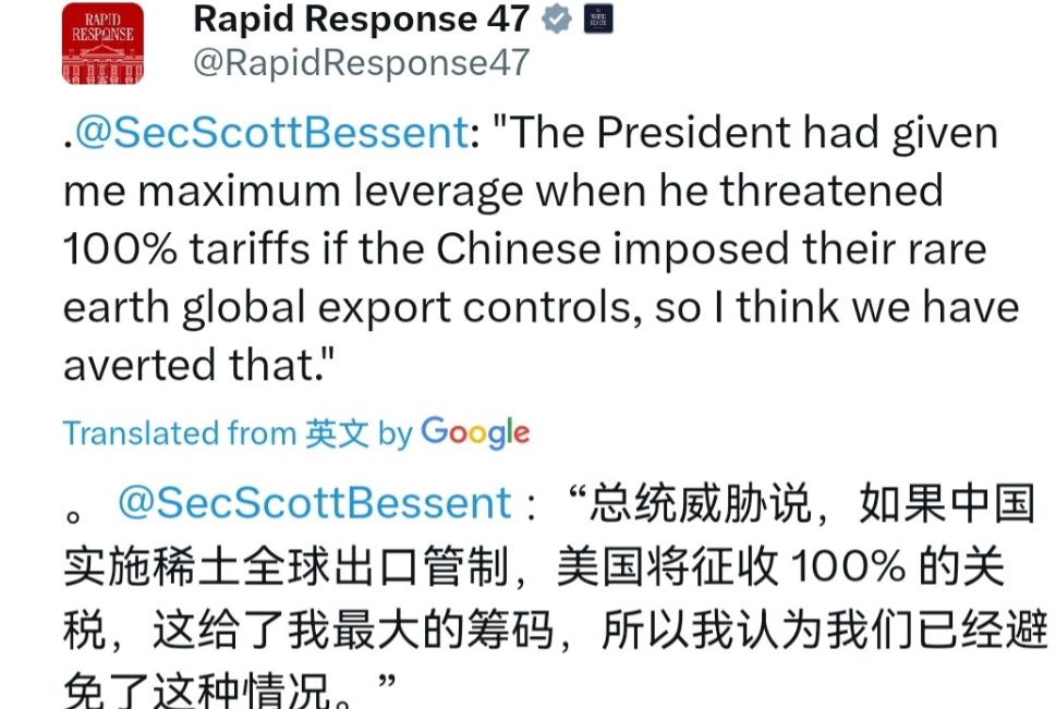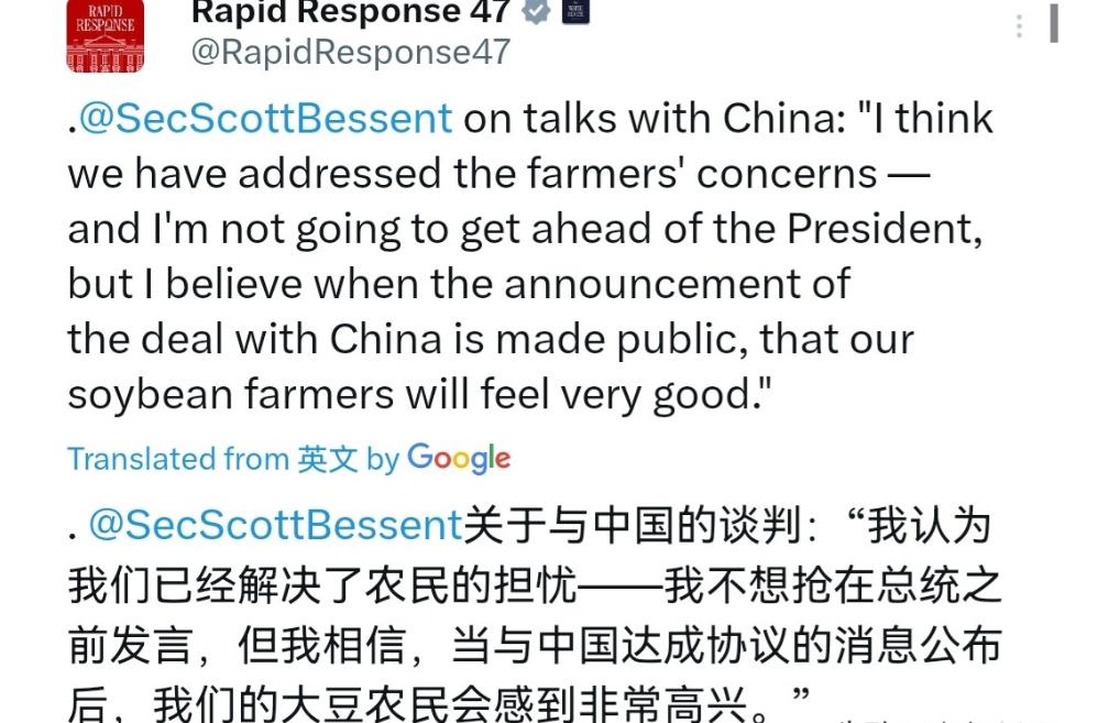 贝森特出来讲话了,中美达成的部分协议被美国曝光!10月26日,美国财长贝森特在接受采访时表示,特朗普总统在11月1日威胁要征收100%的关税,给了我很大的谈判筹码——我相信我们已经达成了一个非常实质性的框架,可以避免这种情况,并允许我们与中国讨论许多其他事情。所以我认为我们已经避免了这种情况。 贝森特这话说得挺直接,一点不绕弯子,明摆着就是把特朗普那 100% 关税的威胁当成了谈判桌上的 “硬通货”。 这操作其实也不新鲜,先把最坏的结果抛出来,逼着对方坐下来谈,然后再把 “避免最坏结果” 当成自己的谈判成果,美国人这套极限施压的路数算是玩得熟门熟路了。 不过她也没把话说死,只说达成了 “实质性框架”,没敢往细了讲,估计是怕抢了特朗普的风头,毕竟还特意提了 “不会抢在总统前面”,这官场分寸倒是拿捏得挺准。 但话里的信息量可不浅,光 “避免 100% 关税” 这一条就够让人琢磨的。要知道这关税可不是针对一两样商品,之前有消息说覆盖的都是机电产品、家具、纺织品这些中国对美出口的主力品类,全是美国零售商离不开的高性价比货源。 真要是加征 100%,最后埋单的还是美国消费者和企业,2024 年那波关税已经让美国家庭一年多花一千八百多美元了,再来这么一下,本就没稳住的通胀怕是真要炸锅。 现在能达成框架避免这事,说白了也是美国自己扛不住,与其说是谈判赢了,不如说是及时踩了刹车。 更具体的信号藏在农民的事儿上,贝森特特意提了 “解决了农民们的担忧”,还打包票说大豆农民会 “感觉非常好”。这答案其实挺明显的,中美之间的共识里,肯定有针对农产品贸易的内容。 中国可是全球最大的大豆进口国,以前也是美国大豆的头号买家,虽说前几年贸易战之后巴西抢了不少份额,但美国大豆农民心里还是盼着能重新稳住中国市场。 2024 年美国对华大豆出口才两千七百万吨,跟巅峰时候没法比,要是协议能让中国多进口点,对靠大豆吃饭的美国农民来说确实是实打实的好处,毕竟秋季收获季眼看就要到了,这会儿能稳住市场预期比啥都强。 贝森特没说透协议的全部内容,但顺着她的话能摸出点门道,中美这轮谈下来,至少在两个关键地方达成了默契:一个是把 11 月 1 日的关税大棒给按下了,先把贸易战升级的风险控住。 另一个就是在农产品上给了美国农民一颗定心丸,这俩问题解决了,才能接着聊 “许多其他事情”。 这倒符合贝森特的谈判风格,不搞一锤定音,先搭好框架,再慢慢填内容,比之前那种硬邦邦的高压谈判要圆滑不少。 不过这话听着也有点给自己脸上贴金的意思,什么 “关税威胁给了很大筹码”,真要是中国不吃这一套,这筹码也就成了废牌。 毕竟现在中国早不是被动接招的样子了,稀土管制、市场转向东盟、国产替代产业起来了,手里的反制牌也不少。 真要逼急了,美国损失的可不止是大豆出口,那些依赖中国原材料的美国企业、靠中国市场的零售商,日子都会不好过。 贝森特心里肯定门儿清,所以才赶紧把 “达成框架” 的消息放出来,先把这波危机解了再说。 现在协议细节还没公布,但从贝森特的口风里能看出,这是个暂时的平衡。避免了 100% 关税,美国那边能喘口气,农民不用慌了,通胀压力也小了点;中国这边也换来了稳定的贸易环境,还能借着这个框架接着谈其他议题。 说白了,这不是谁赢谁输的问题,是两边都明白硬刚没好处,才找到的一个台阶。 贝森特特意把消息放出来,估计也是想先稳住国内情绪,尤其是农业州的票仓,毕竟接下来的选举不远了,农民的态度很关键。 至于后续还能谈出些什么,就得看两边的诚意了。但不管怎么说,能把 100% 关税这颗雷给排除掉,对中美两国的企业和消费者来说都是件好事,总比天天盯着关税威胁过日子强。 参考文章:非常点评 10.27 谈判结束,李成钢和贝森特说法不一样,特朗普:中国希望达成协议