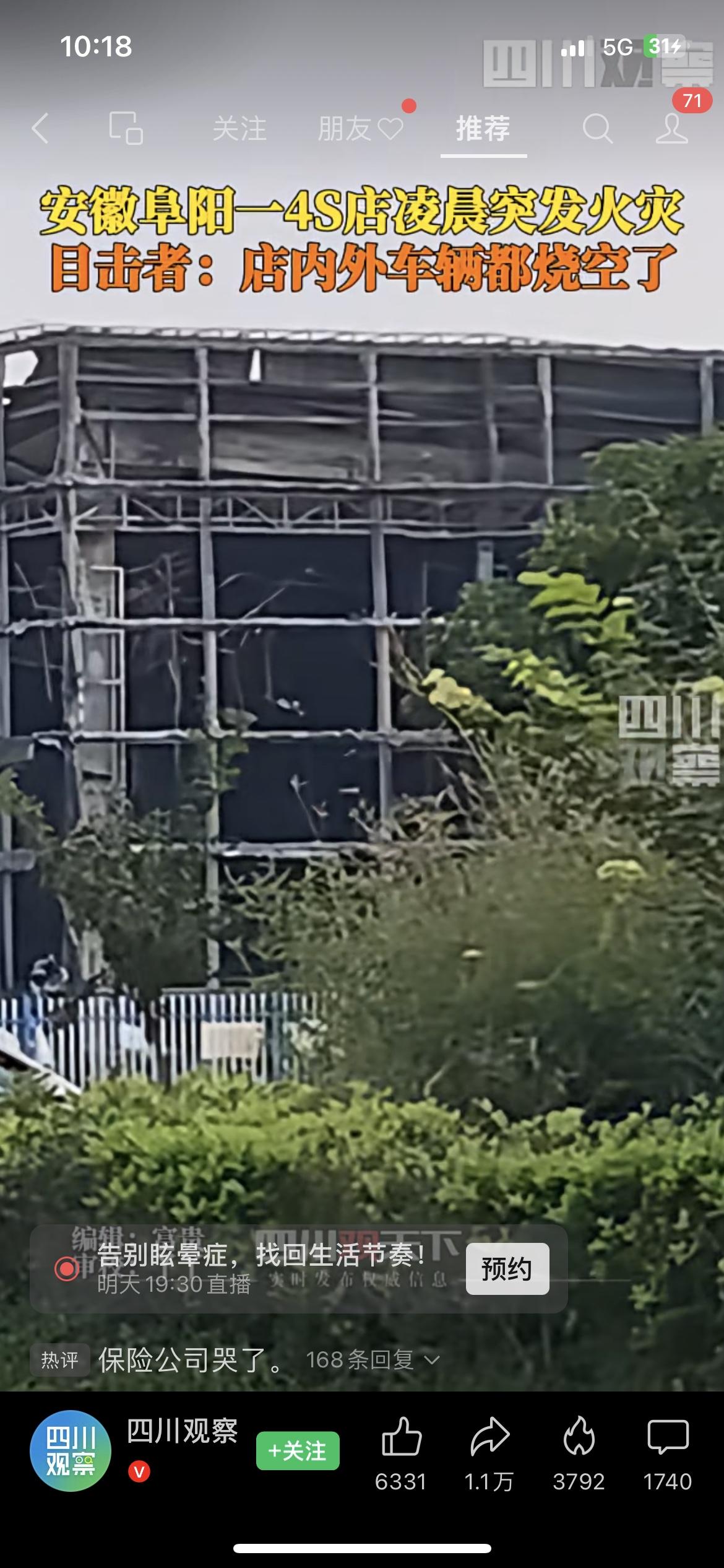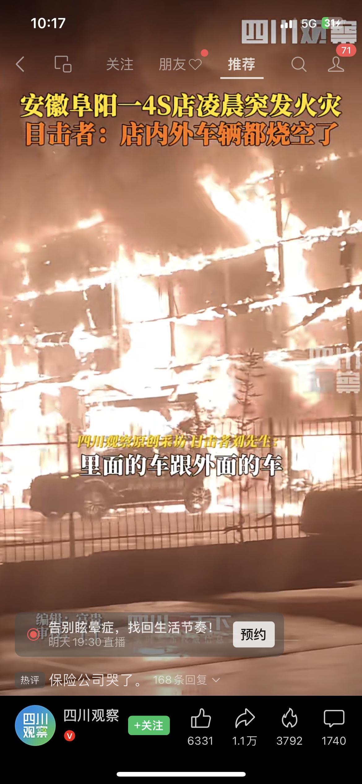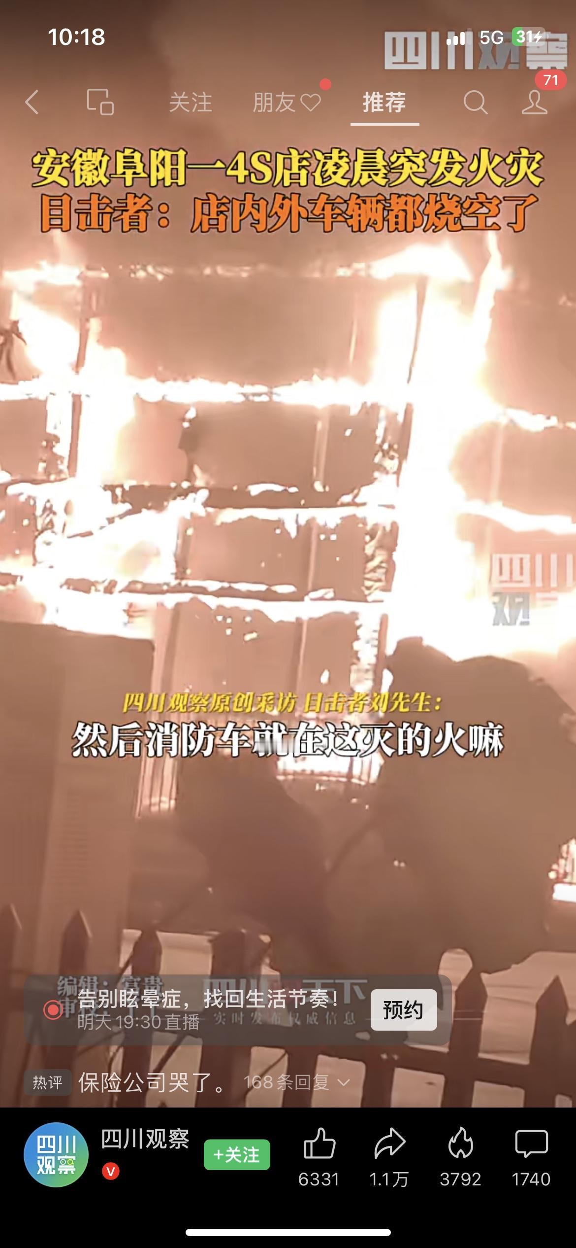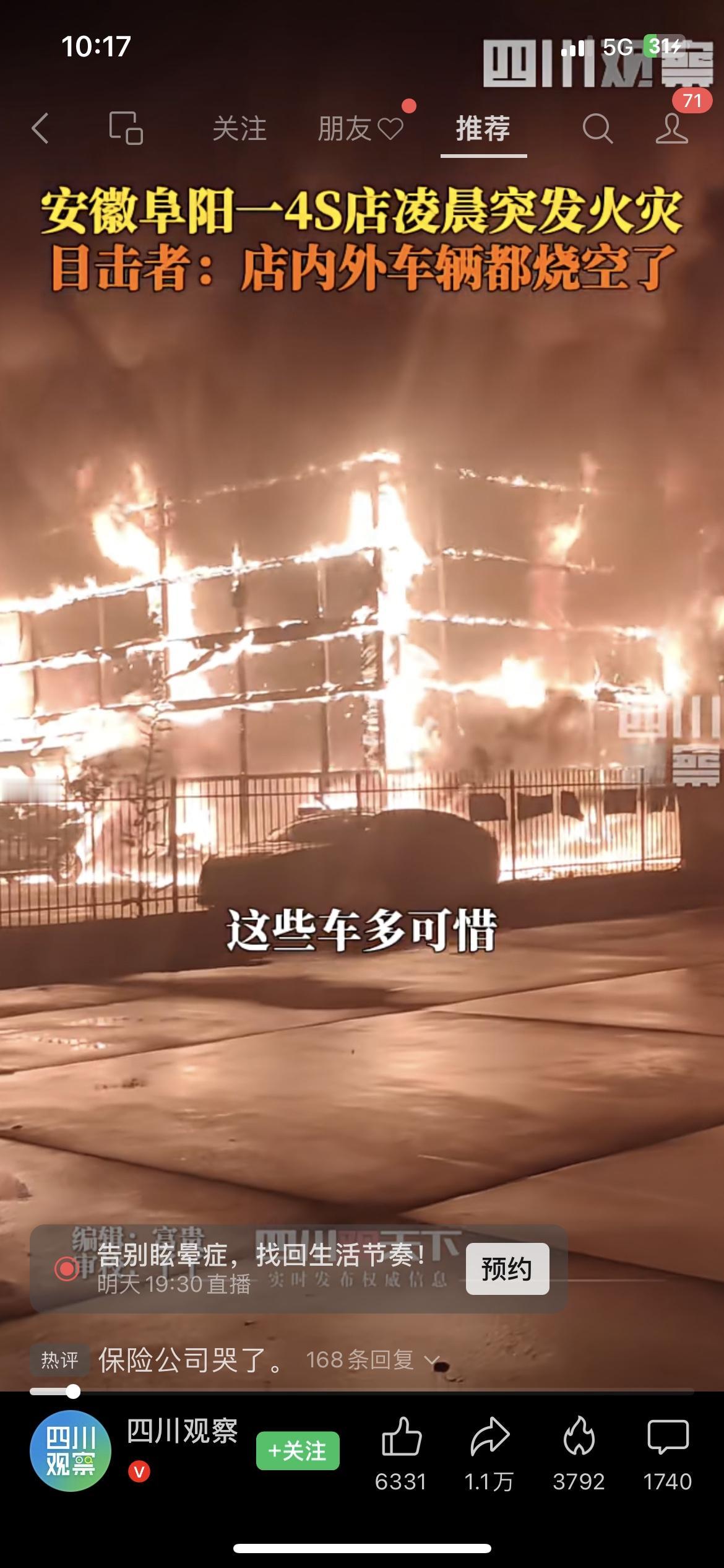 凌晨火光冲天!阜阳4S店烧成废墟,几十辆新车秒变废铁! 太吓人了!安徽阜阳一4S店凌晨突然起火,目击者说火刚起来的时候,整个店都被烧得通红,店里摆的新车、外面停的展车,全烧成空架子了! 现在消防已经把火灭了,但整个店基本成了废墟——想想这损失得多大?保险公司看了都得心疼!目前起火原因还在查,希望现场没人员受伤。 秋冬天干物燥,不管是店面还是家里,插座、线路这些防火细节真的得绷紧弦啊!