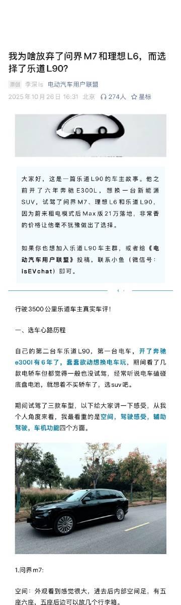 "我为啥放弃了问界M7和理想L6,而选择了乐道L90?" 一位奔驰E车主,试驾了问界M7、理想L6和乐道L90后选择了L90的心路历程【来自懂车帝车友圈】