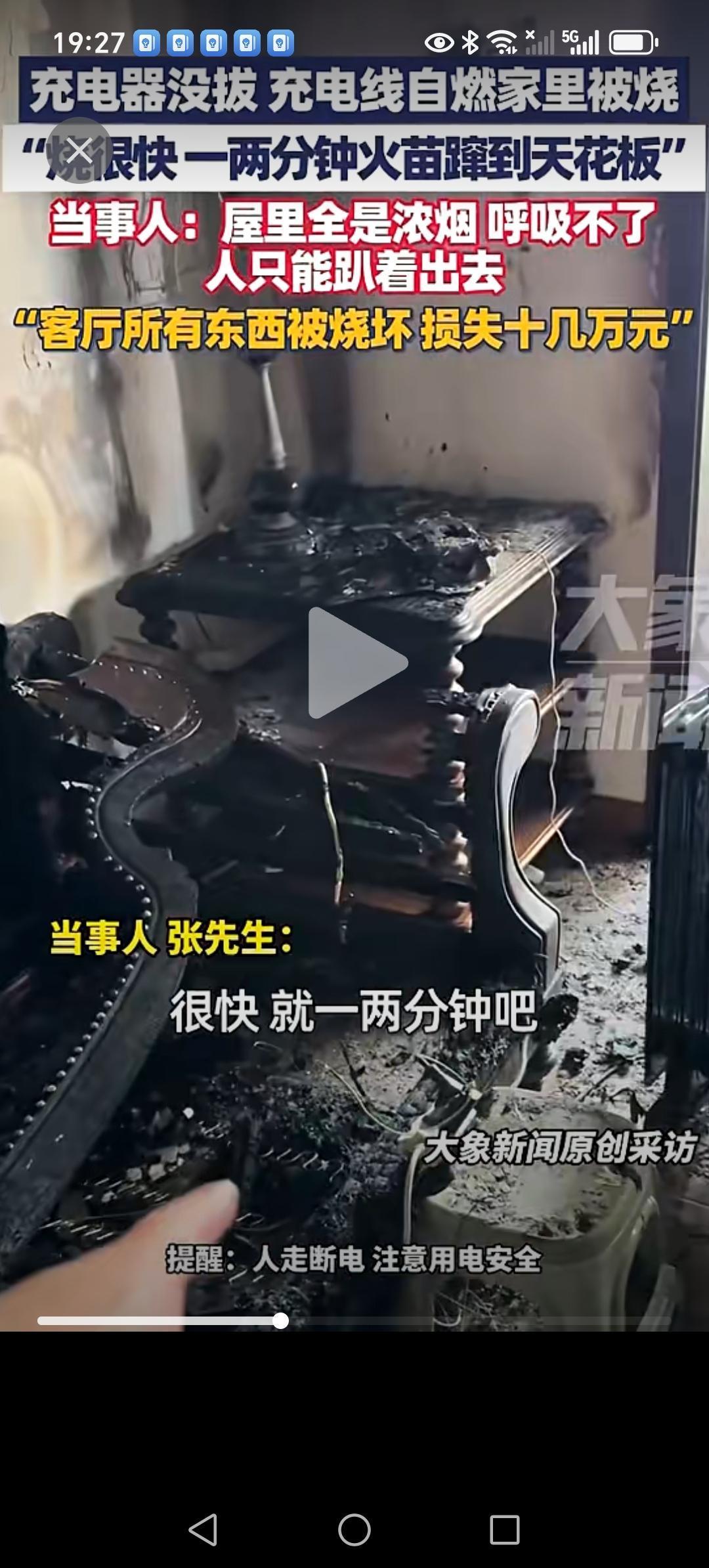 最近老刷到充电器引发火灾的视频,看得我心惊!四川有户人家就因为没拔充电器,火苗一两分钟就蹿到天花板,损失十几万 。 说真的,我以前也犯懒,充电器常年插插座上,就图省事儿,顶多出门时关掉插座开关。但后来才知道,就算关了开关,充电器还在待机发热,元件老化照样有风险。 这事儿真不能侥幸!每年因为这些引发的火灾超2万起。咱就多一个拔插头的动作,睡前和出门前顺手一拔,能预防火灾隐患,全家都安心!