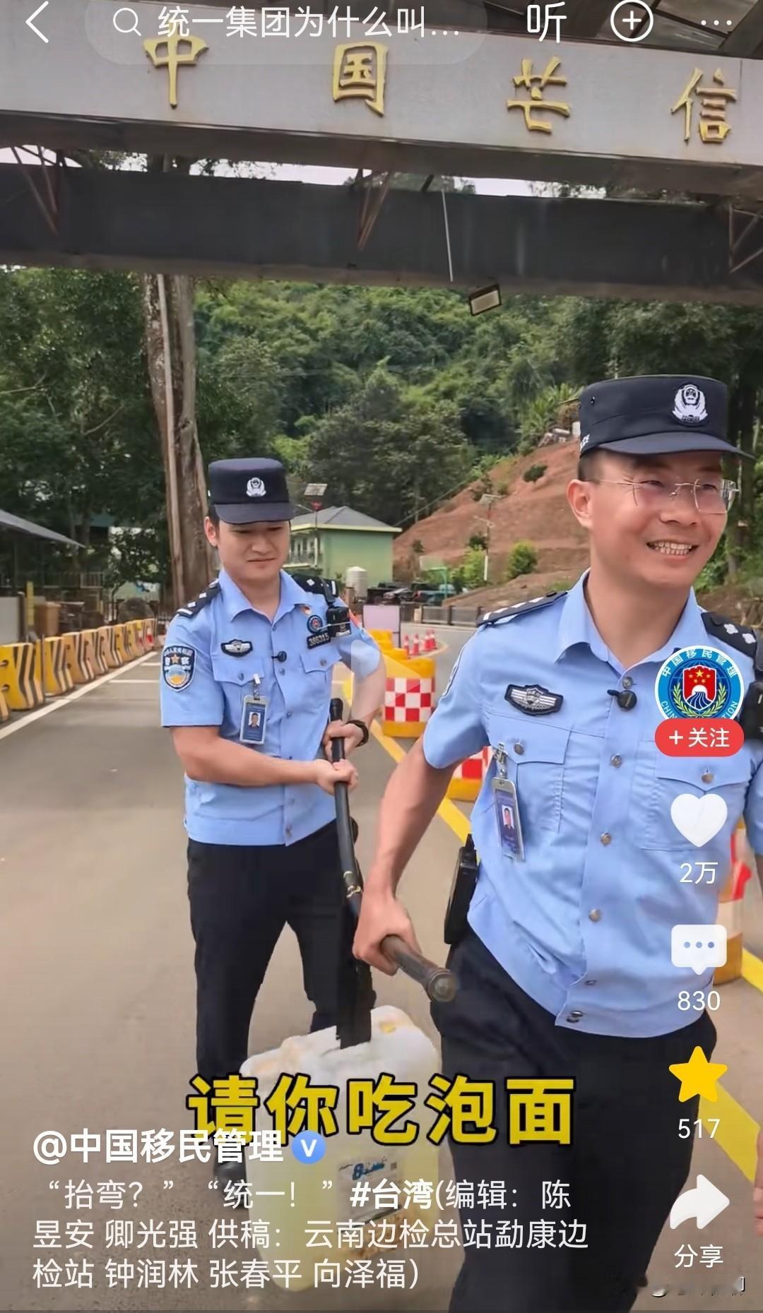 偶然间看到中国移民管理局近期发的一段内涵视频,感觉很有趣,不过,现在官媒都这么直接了吗?简直不可思议,下面我来给大家还原一下原视频对话。 警察甲 :“书记,抬弯了,抬弯了” 警察乙 :“抬弯?抬弯了也要回家,过了这座桥就是家了……走,回家,请你吃泡面” 警察甲 : “吃什么泡面啊,书记” 警察乙 : “统一” 看到这,不知道大家饿了没,想不想来一碗“统一”泡面!(图片来自网络) 中国移民 移民争议 国际移民问题 国家移民管理队 国家移民 移民局 移民打假