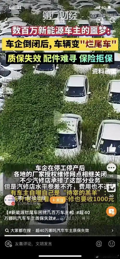 销量暴涨40%,百万车主却陷“修车无门”:新能源洗牌,别让消费者买单! 一边是新能源车销量半年狂卖693.7万辆、同比暴涨40.3%的火热行情,一边是威马、哪吒等车企接连破产后,数百万车主捧着“烂尾车”求助无门的冰冷现实。中消协刚点名的“退市车企售后无保障”投诉焦点,藏着太多普通人的无奈与愤怒。 北京车主张磊的遭遇戳中了无数人:20万买的威马EX6,如今4S店人去楼空,车机断网、导航失灵,只能靠车友群的破解版软件勉强续命 。更糟的是撞坏的保险杠等了半年没货,他被迫学着自己换滤芯、修剐蹭,活生生熬成“半个修理工”。浙江的黄明谦更绝望,哪吒破产后保险公司直接拒保车损险,找小众公司续保保费涨了2000元,想卖车止损却发现20万的车连7万都卖不掉 。 那些购车时吹得天花乱坠的承诺,早成了废纸。“三电系统终身质保”“永久免费流量”,这些当初撬动消费的诱饵,在车企破产公告前瞬间失效。更讽刺的是,《汽车销售管理办法》明明要求车企停产后保障10年配件供应,可现实是威马破产前80%的维修网点就已关闭,原厂配件仓库早被查封 。 骗子们的套路,说白了就是抓住了人性的弱点——“贪”和“怕”。他们先用“一夜暴富”勾住想走捷径的人,再用“官方背景”打消顾虑,最后用环环相扣的骗局收割。那些伪造的红头文件、假扮的“领导”,不过是给骗局穿了件“合法外衣”。 这事儿最该警醒的,是抱着“赌一把”心态的人。要知道,真正的国家战略物资交易,根本不会通过民间渠道找人“垫付资金”;但凡正规生意,也绝不会用“保密”“高额回扣”当噱头。更关键的是,伪造国家机关公文可不是小事,根据《刑法》,情节严重的要判三年以上十年以下有期徒刑,骗子敢铤而走险,就是吃准了受害者想发财又不敢声张的心理。 如今国家安全机关的提醒,就是给所有人敲警钟:天上掉的从来不是馅饼,是陷阱。那些看似“稳赚不赔”的冷门生意,十有八九是骗局。 你身边有人听过类似的“发财门路”吗?是一早就识破了,还是差点上当?评论区聊聊,帮更多人擦亮眼睛!。新能源车残值率 新能源汽车残值