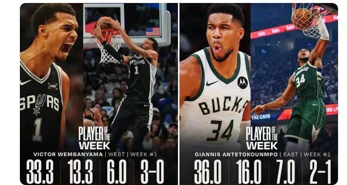NBA常规赛首周最佳球员! 字母哥碾压,文班亚马 直接改写西部格局? 刚开赛一周,NBA就炸出王炸级表现!字母哥带着雄鹿2胜1负,场均36+16+7的数据简直离谱,这哪是打球?分明是拿着数据框疯狂收割,东部最佳拿得毫无悬念。 但更让人惊掉下巴的是文班亚马!马刺3战全胜不说,他场均33.3+13.3+6盖帽的表现,直接把“新人墙”干碎了。要知道这可是菜鸟赛季首周,他居然能用攻防两端的统治力带马刺赢球,这天赋真的要提前预定未来第一人了? 以前总说新人得适应联盟,文班倒好,直接让联盟适应他。字母哥的稳定输出早见怪不怪,但文班这势头,会不会让西部从“群雄逐鹿”变成“马刺提前崛起”?你们觉得这俩本赛季能一路猛到最后吗?
