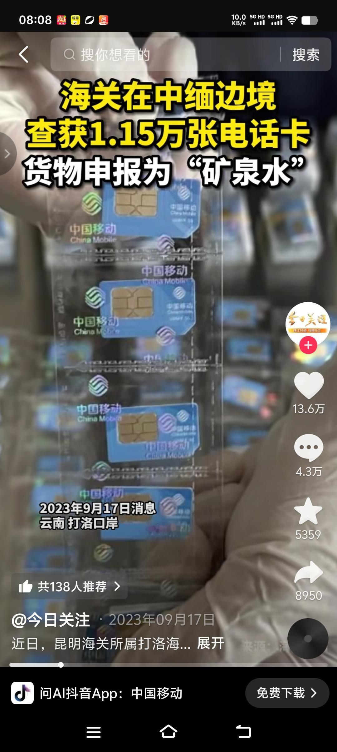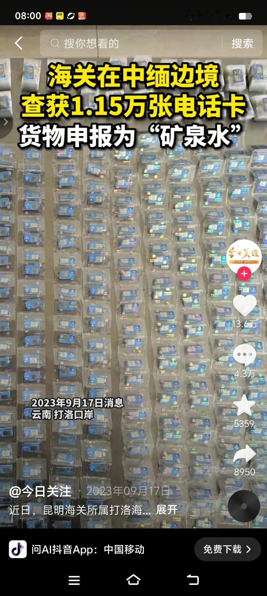 我就想问一下中国某动,1.15万张手机卡是怎么出现在中缅边境上的。货物申报为矿泉水,实则46盒手机卡,未向海关如实申报,说明手机卡来历不明。很难想象如果这1.15万张手机卡落入电诈分子手中,那将会有多少家庭受害。 我们知道想办一张手机卡,必须拿身份证亲自办理,如实填写个人详细资料,甚至还要进行刷脸,其目的就是为了杜绝诈骗,更好的掌握不法分子的踪迹。所以说有些时候不是电诈分子有多聪明,多嚣张,而是他们钻了空子,有机可乘。