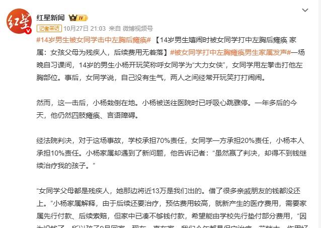 其实就是语言霸凌,男孩给女孩开玩笑就是,语言霸凌。 我认为男孩应该承担40%的责任,学校50%,女孩10%。 法院判女孩13万,整体责任是大约是六十多万。 有热度也好,网上有爱心的捐赠点,提高好的治疗。 14岁男生被女同学击中左胸后瘫痪 我初中就是有一个这样的被全班爱开玩笑的一个人,(其实就是谁都开他的玩笑,男可以揍一下) 总是被我们班级的那个调皮(其实就是爱动手揍人家)不是这个人踹就是那个人打。 不过有一个好吃就是,“带头大哥”是个小富经常给人十块二十买点零食剩下的就是跑腿费。你们上学时候有这样的人吗?