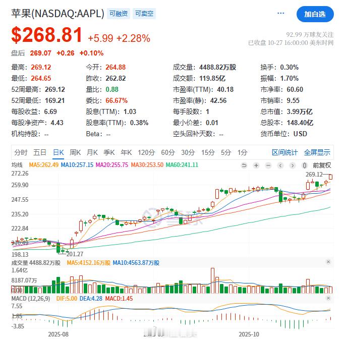 苹果总市值逼近4万亿美元 苹果这一波上涨,市值已经来到了3.99万亿美元。