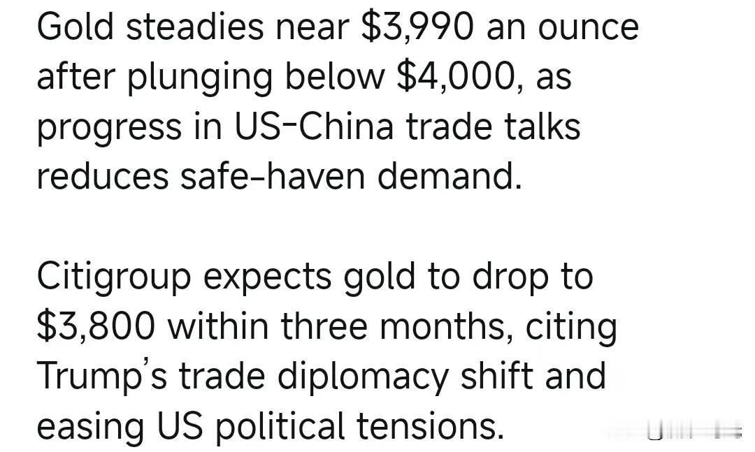 由于中美贸易谈判取得进展,降低了避险需求,金价在跌破 4,000 美元后稳定在 3,990 美元/盎司附近。 花旗集团预计,由于特朗普的贸易外交转变和美国政治紧张局势的缓解,黄金价格将在三个月内跌至3800美元。
