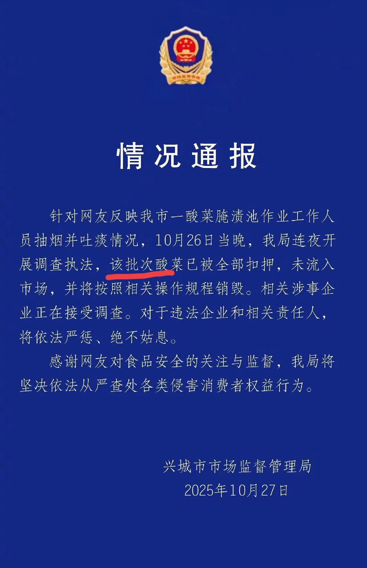 官方通报男子酸菜池中抽烟吐痰,表示该批次酸菜已被全部扣押,未流入市场。就这批次……该男子就这一次?拍到就这一次。 清清嗓子,使劲一咳,一口浓痰啪的吐在酸菜上,再用脚来回蹭蹭。深吸一口烟,烟灰直接弹落在酸菜上。动作行云流水,自然熟练。 你信他是第一次操作?吐痰是第一次,抽烟也是第一天学会的?真是老“痰”酸菜!2022年“土坑酸菜”事件,还历历在目,现在又整这一出,真是次次挑战大众对食品的忍耐度和宽容度! 太恶心了!一而再的,就算这批没有流入市场,我也不买制成品酸菜了。自己做更放心,老百姓花钱买点儿吃的也是操碎心! 如果若相关单位仍监管持续乏力、处罚力度重拿轻放,威慑力不足,“曝光-整改-反弹”模式只会重复不断。