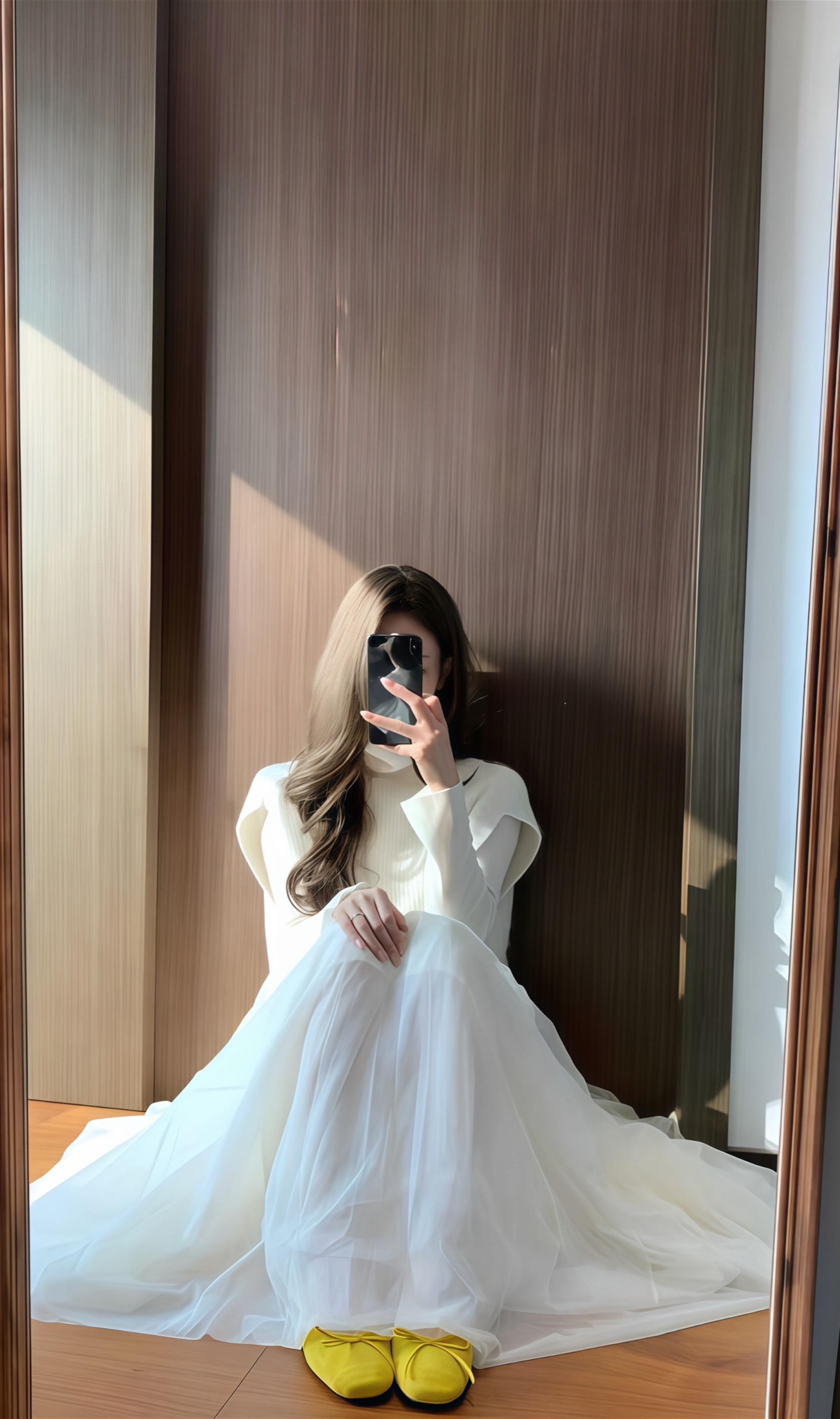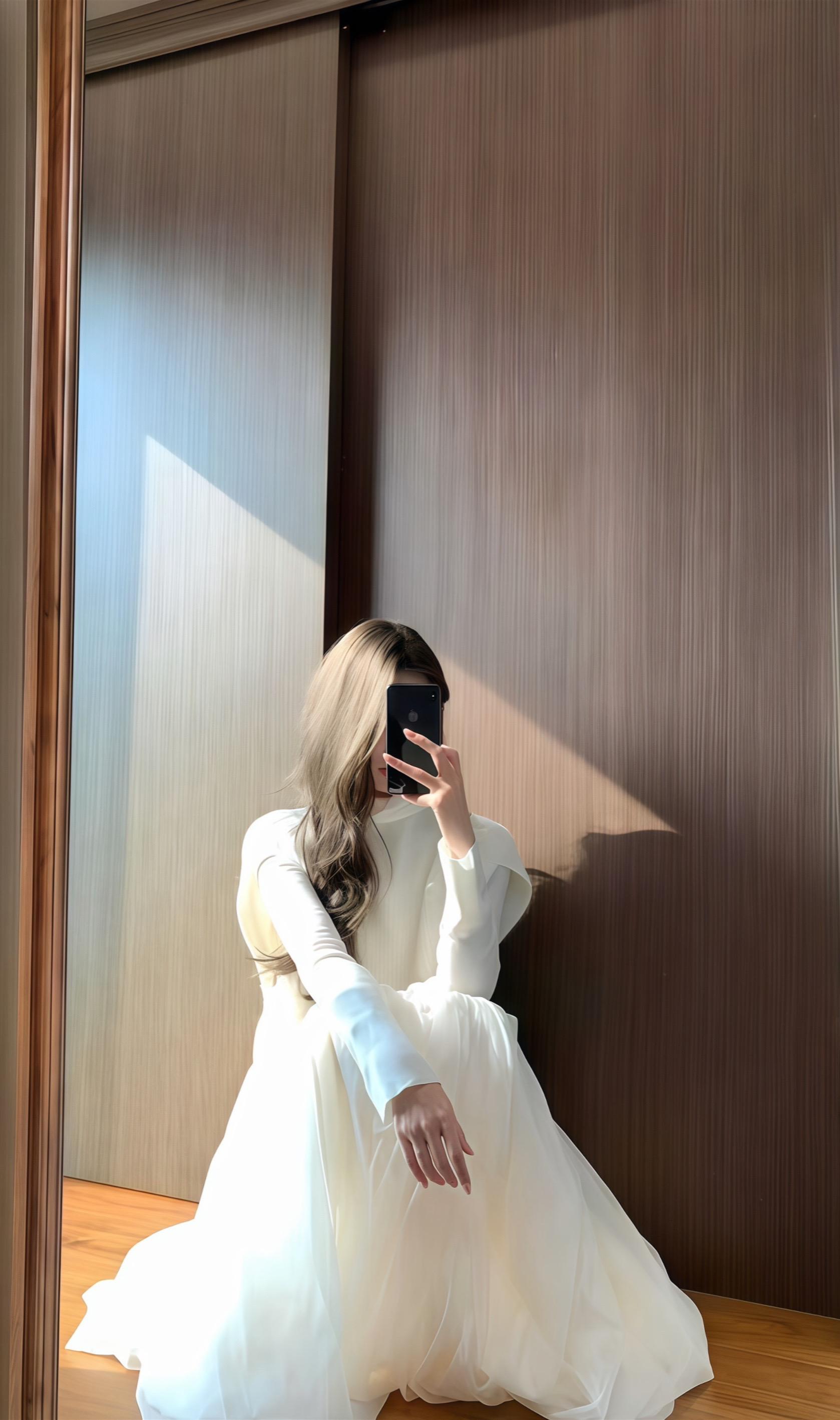 粉色连衣裙,优雅气质,镜前自拍,美不胜收!