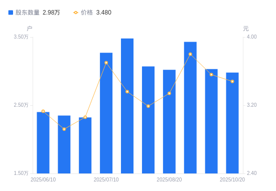 日期A股户数(户)流通A股户均持股数(股)户均持股市值(万元)2025-10-202980044001.5815.312025-09-303030743265.4815.402025-09-193430038228.7814.532025-08-203020043418.7814.502025-07-313070042711.6313.632025-07-183480037679.5112.662025-07-103270040099.3014.842025-06-302321856475.4517.282025-06-202350055798.0616.292025-06-102400054635.6117.10