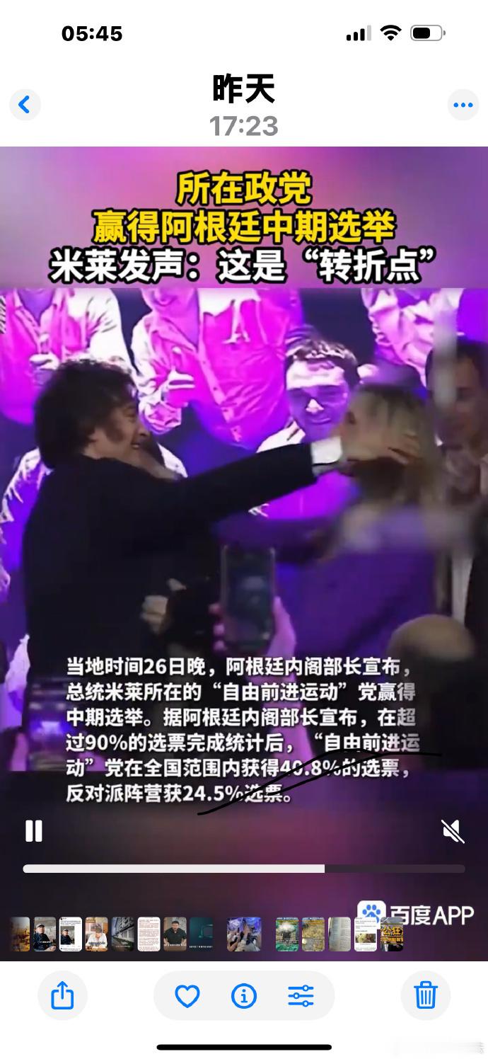 米莱大胜【阿根廷总统哈维尔·米莱中期选举取得重大胜利 】阿根廷中期选举 米莱的政党获得了 41% 的选票,在议会中的席位将从 37席增至101席,参议员人数也将从 6席增至20席。