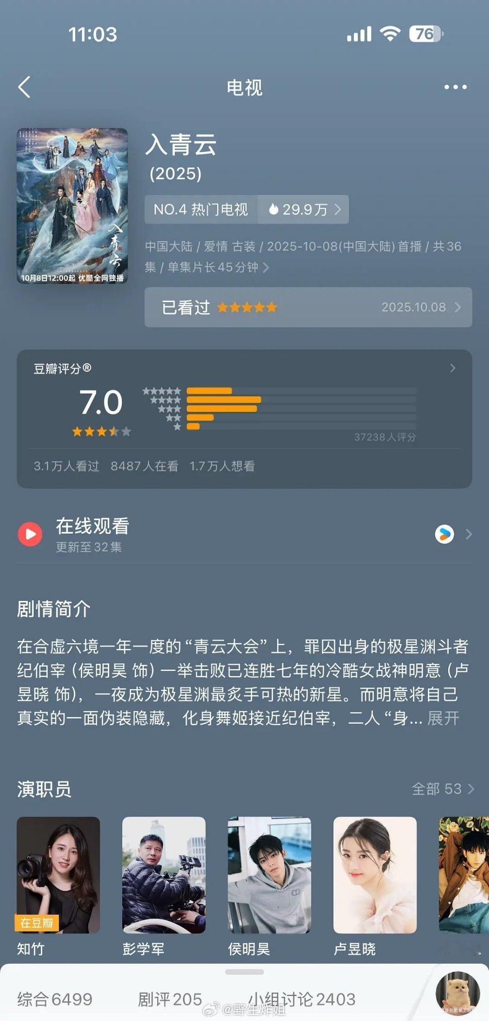 侯明昊卢昱晓《入青云》豆瓣开分7分