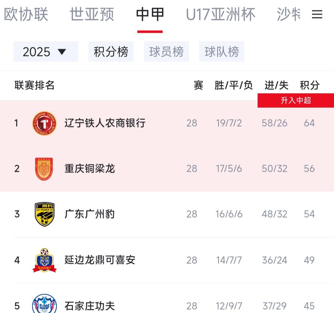 中超降级队和中甲升级队,基本上确认了。 前中超冠军武汉三镇,应该保级成功。 青岛海牛21分。 梅州客家20分。 长春亚泰19分。 这三个队降2个去中甲,还有两轮。 中甲这边辽宁肯定升级,重庆和广州再升上来一个。 感觉青岛有两个中超队,球市太满降一个。 辽宁刚好顶替长春亚泰,东三省还在中超。 希望重庆升上来,明年和成都踢川渝德比,场面一定很火爆![大金牙]
