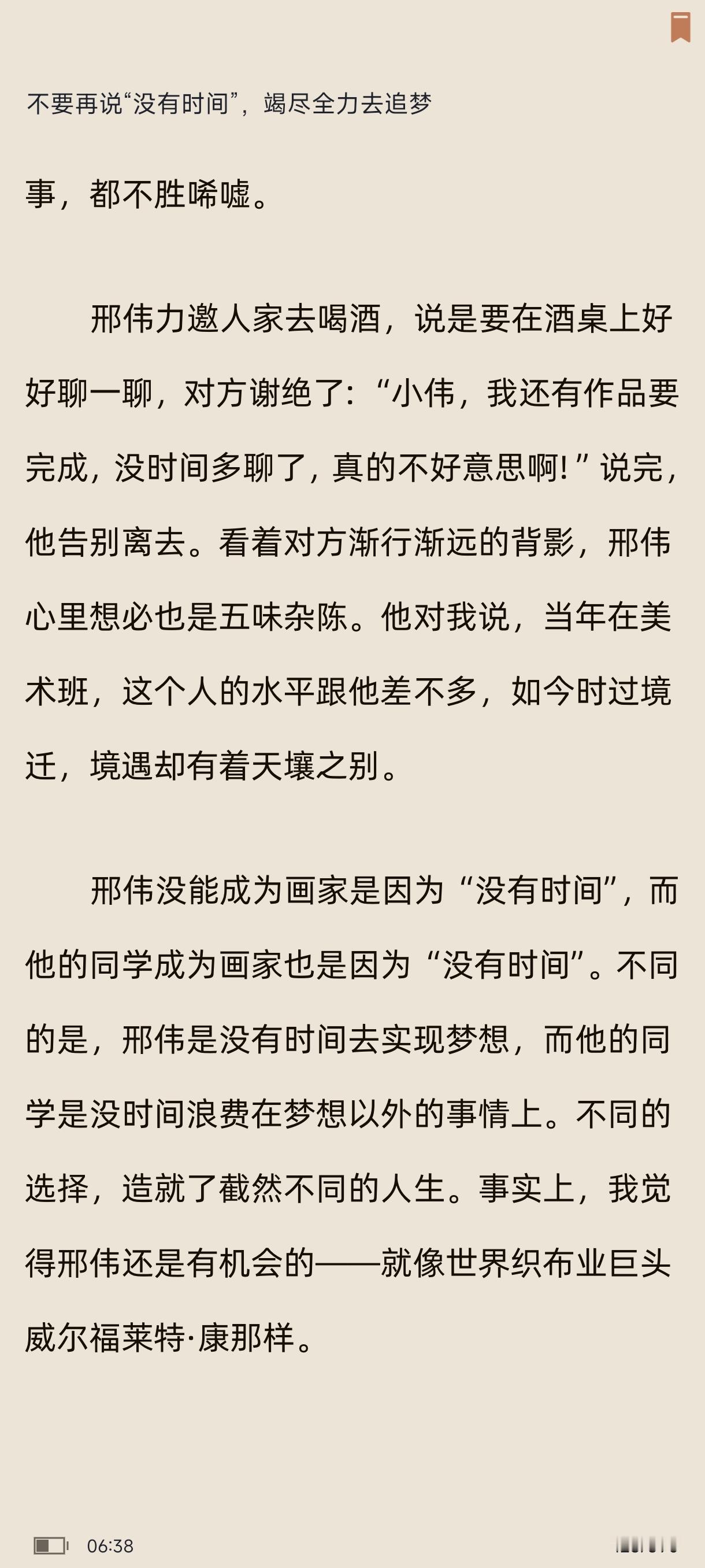 同样的起点, 一个因为“没有时间”, 不能成就自己的画家梦; 一个因为“没有时间”, 成为了众所周知的画家。 而这“没有时间”, 却是有差别的。 一个是没有时间去为梦想而努力, 一个是没有时间花费在梦想以外的事。 所以,是真的“没有时间”吗? 一天5分钟, 一个礼拜35分钟, 一个月150分钟, 一年1825分钟。 积少成多,日积月累,这是你没去算过的数字吧? 今天,就用5分钟来挑战一下梦想的开端吧!记得回来打卡哦! 每日读书打卡分享今日的感悟