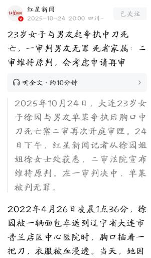 辽宁大连,23岁女子和男友同居期间,两人因琐事发生争吵,男友言语辱骂,并暴力击打女子头部脸部,还将她拖拽倒地,导致女子浑身是伤。回家后,女子便左胸中刀,抢救无效不幸去世。男子坚持表示,女友是自杀,而且她患有抑郁症。但女子家人朋友都证明,她没有表现出任何抑郁倾向,而且男子还有前科,所以认定是被男子所害。随后,男子以“过失致人死亡罪”被提起公诉,但法院的判决却让人无法接受。 2025 年 10 月 24 日,大连徐园的姐姐接到二审判决时,当场哭瘫在法院走廊 ,打了妹妹的男友单某,还是被判无罪,这个结果,让这家人在三年里第三次尝到绝望。 一切要回到 2022 年 4 月 26 日凌晨 1 点 36 分。普兰店区中心医院的急诊室里,23 岁的徐园被面包车送来时,左胸插着水果刀,白衣服浸满鲜血,没等抢救就没了呼吸。送她来的,是刚同居半个月的男友单某。 “她自己捅的,有抑郁史。” 单某面对警察时很镇定,但徐园的姐姐立刻反驳:“我妹开朗得很,倒是他,早把人打得满身伤!” 警方调取的细节,拼凑出那个恐怖的春夜:4 月 25 日晚,两人和朋友喝酒后回家,竟因一包方便面吵起来。 单某摔门而出,裹着浴巾的徐园追出去,在楼下被他拳打脚踢 ,法医后来鉴定,她双眼、鼻子全是钝器伤,徒手就能打出来。 更让人脊背发凉的是单某的过往:2014 年因故意伤害坐牢,缓刑期又聚众斗殴加刑四年,2021 年还因殴打他人被拘留 15 天。 案发前 6 天,他刚在父母的殡葬店里打过徐园,单父调解后两人 “和好”;案发前 3 天,他还在微信里骂徐园 “你去死吧”。 可三次尸检后,鉴定意见写着 “胸口刺创本人可以形成”。水果刀被血污染没了指纹,出租屋没监控,邻居只听见争吵没亲眼看见动手。 法院最终认定 “证据不足”:单某无法预见殴打会引发自杀,且事后送医算 “积极救助”,2023 年 9 月一审判无罪,2025 年 10 月二审维持原判。 “被打得鼻青脸肿,还能冷静换好衣服、精准捅心脏?” 徐园姐姐的质问,戳中了无数网友的痛处。这起悲剧撕开的,是亲密暴力维权的三重死穴: 证据太容易断链 , 受害者死无对证,施暴者一句话就能推翻指控。 暴力前科被忽视,单某三次犯案,却没被认定为 “危险人格”;求助渠道太滞后 ,徐园 4 月 20 日被打后没报警,仅找男友父亲调解,错失止损机会。 其实早一步行动,可能救回一条命:被打后立刻就医留病历、拍伤情照,哪怕口头申请,法院 72 小时内就能发人身保护令,打 12338 找妇联,或去社区临时避难所,都能躲开魔爪。 如今徐园的出租屋早换了主人,但她的悲剧该醒着所有人:家暴从不是 “家务事”,第一次动手就要零容忍。那些 “和好” 的假象下,可能藏着致命的拳头。 徐园的故事该叫醒所有人:感情里的保护从不是懦弱,遇到伤害立刻抽身、寻求帮助,才是对自己生命的负责。 也盼着未来有更完善的机制,让警方更早介入家暴、司法更重视暴力与悲剧的因果,让每个受伤害的人都能得到公正,不再让这样的遗憾重演。 对此,你有怎么样的看法呢? 信息来源:红星新闻