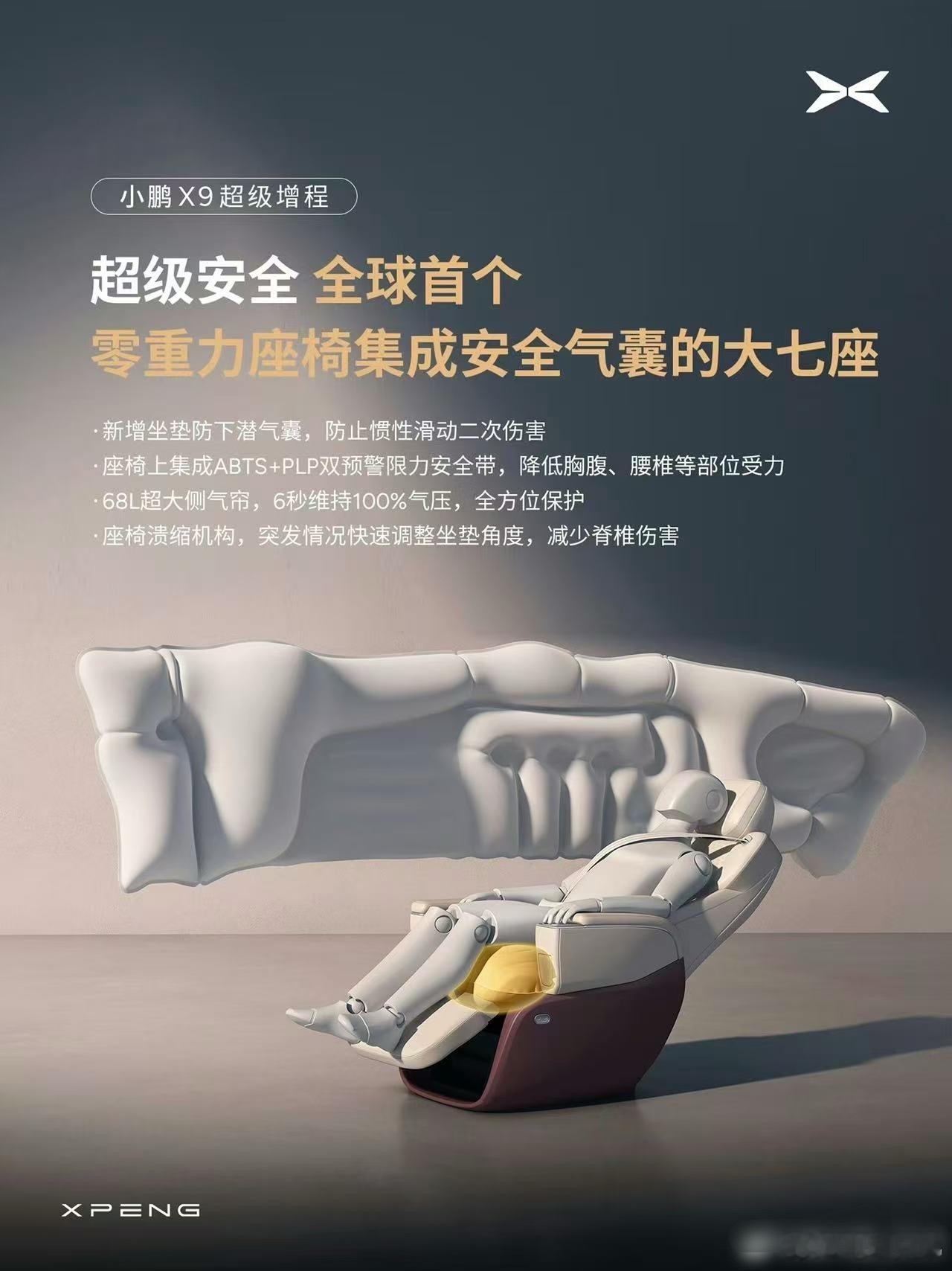 国内第一款大6座上座椅防潜滑气囊的是蔚来新8的6座版,第一款7座车有这个的还真是小鹏X9超级增程。