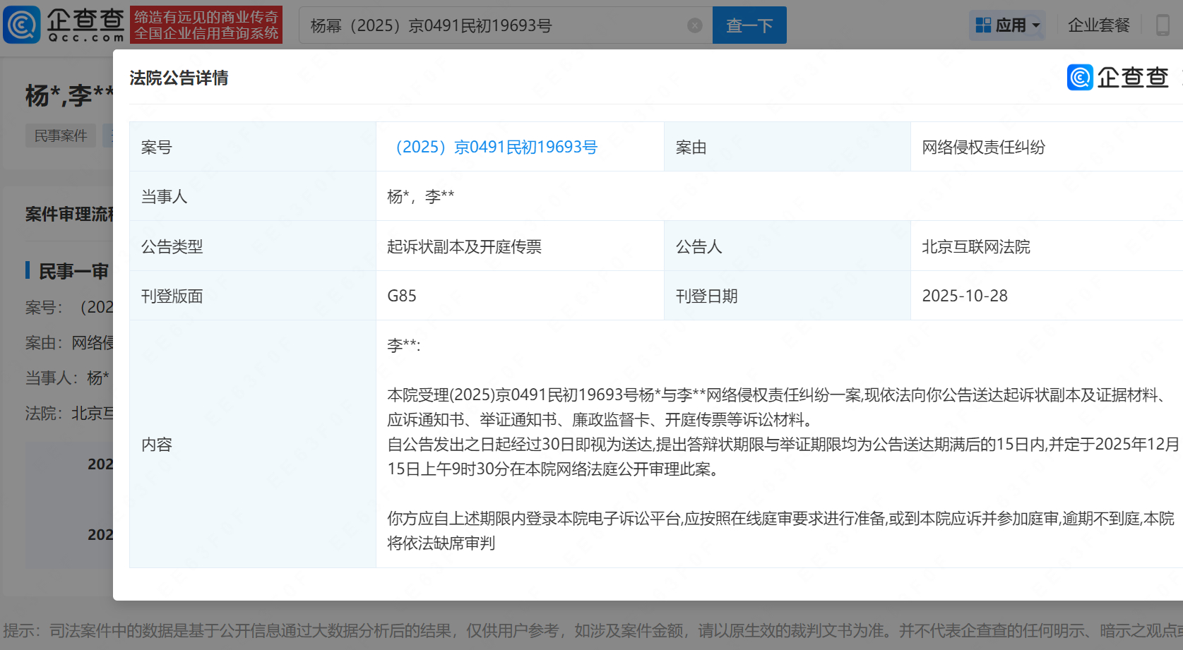 【杨幂新增维权案件】杨幂维权案12月开庭企查查APP显示,近日,法院向李某某公告送达起诉状副本、开庭传票等诉讼材料,涉杨幂与李某某的网络侵权责任纠纷案,该案定于2025年12月15日上午9时30分在北京互联网法院公开审理。