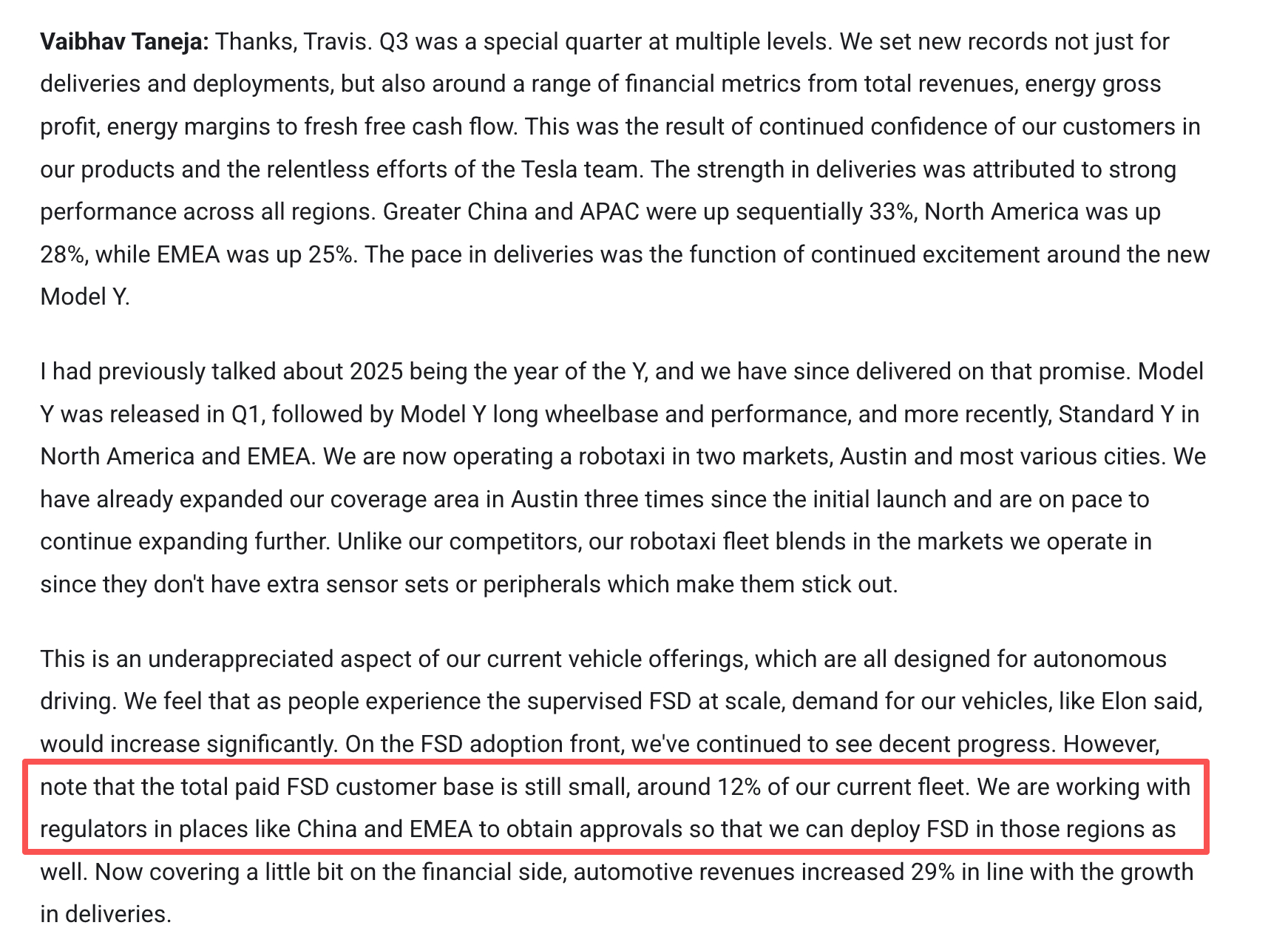 特斯拉 CFO Vaibhav Taneja 在上周的特斯拉财报会议上公开了特斯拉 FSD 的选装渗透率为 12%,考虑到 FSD 仍未在重要的海外市场如中国、欧洲等全量推送 FSD,这个数字的参考意义不大,误导意义反而比较大。