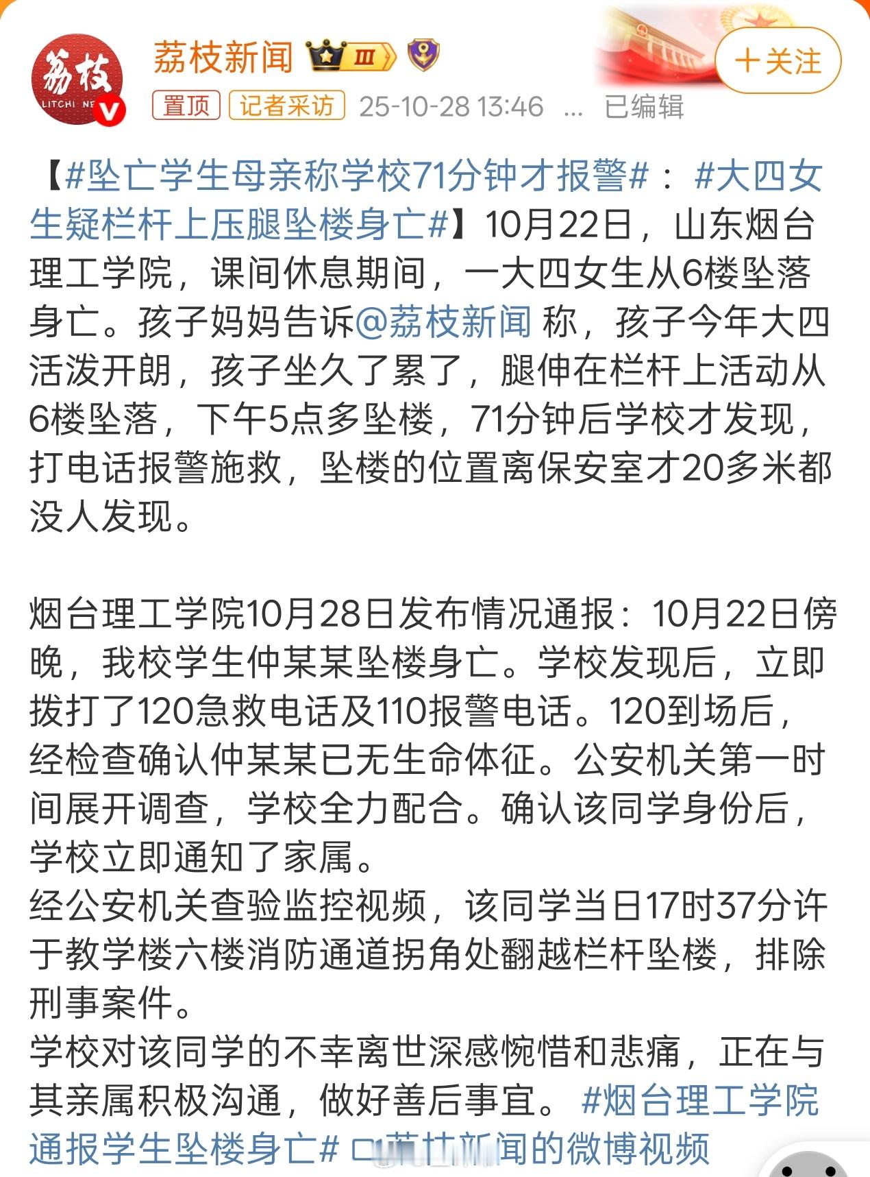 坠亡学生母亲称学校71分钟才报警