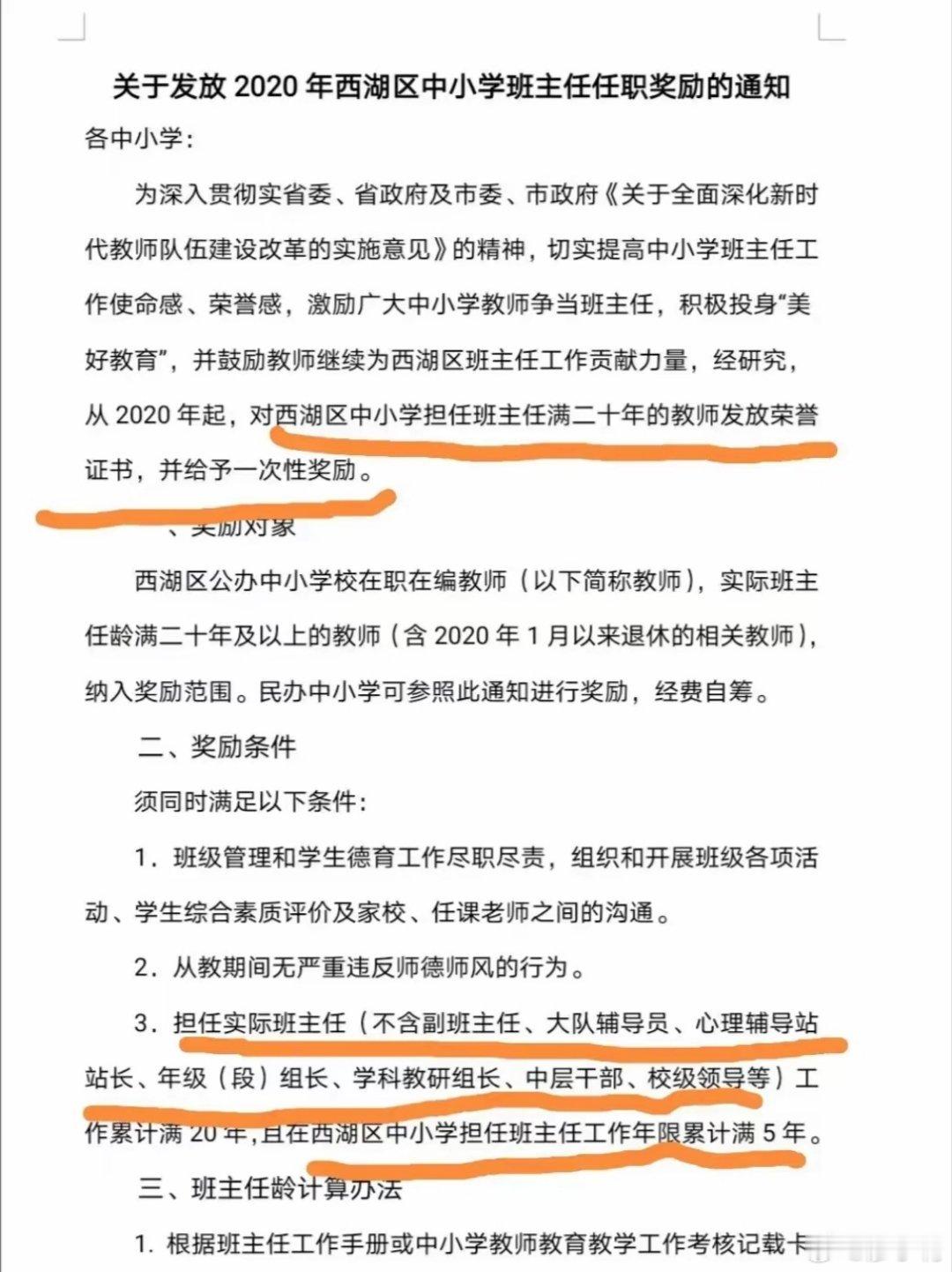 杭州市西湖区政府教育大手笔!对于连续担任二十年班主任的老师,给予五万元现金奖励。很多人担心这笔奖励又会被领导拿走,放心人家早就考虑到这一点,奖励条件中有一项规定:二十年班主任龄必须是实际班主任龄,副班主任、中层、校级领导都不能折算班主任龄。这一规定避免了以前在评职、晋级、评优时,领导职务成了万金油,什么都可以当的陋习。杭州西湖区用实际行动来尊师重教,值得点赞!热点观点