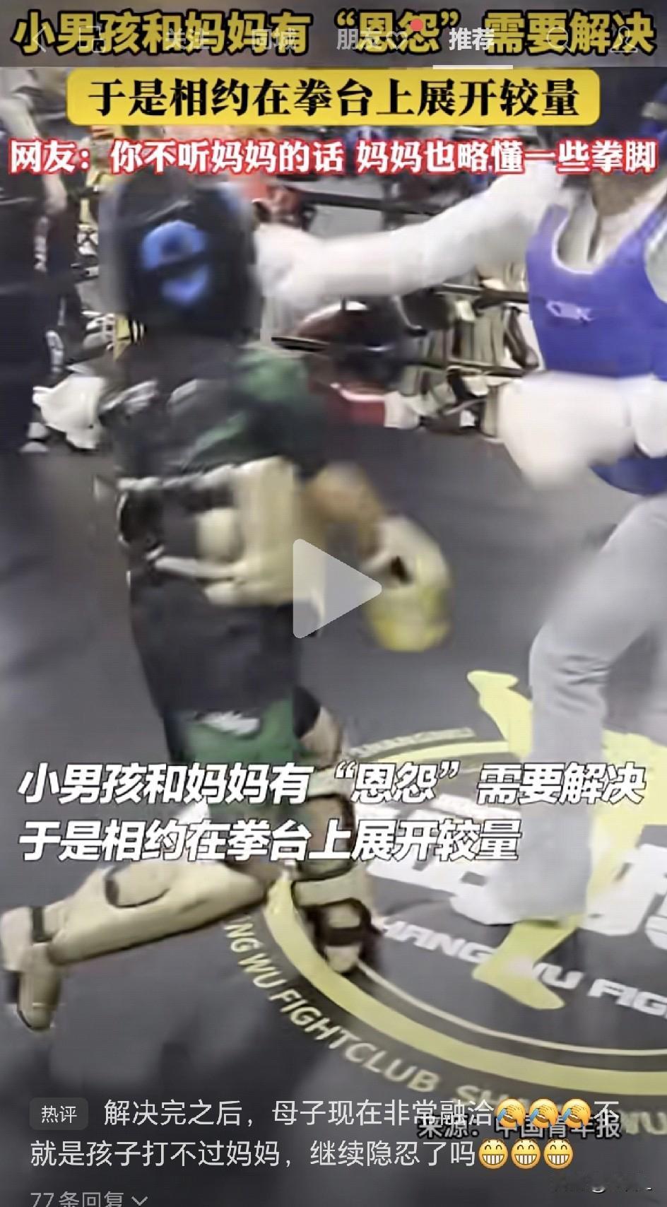 8岁拳击冠军飘了,写作业敷衍妈妈?妈妈“揍”服冠军儿子后,母子双双坦言:挺解压! 近日,内蒙古包头,一家拳击俱乐部发布了一段视频,引发了全网热议。 视频里的小男孩,是拳击俱乐部的成员。刚刚获得8岁组拳击冠军,有点小傲娇,人有点飘。 所以出现了写作业磨磨蹭蹭的情况,很敷衍而且态度还不好。妈妈心生不满,想教训教训他,却一直没找到合适的契机。 没想到,妈妈还没行动,男孩先主动出击了。男孩给教练发语音,说自己要挑战妈妈,和妈妈在台上打一场,到时候谁赢了就听谁的。 正愁找不到机会的妈妈,一听就乐了,刚好妈妈也有一些拳击基础,娘俩一拍而合,相约在拳台上一较高下。 台上,妈妈的一招一式还挺有模有样,每一拳、每一脚的力度都恰到好处。而男孩也是拼尽全力,想展示自己的能力。 妈妈借拳击对抗发泄了积累的情绪,孩子也在竞技中释放了压力。 这场比试的意外之喜是:男孩写作业变得认真,母子俩恢复了和平相处的状态,双方都觉得“挺解压”。 看到视频里男孩被妈妈“揍”得东倒西歪,又努力想“打”倒妈妈的样子,评论区的网友们是看热闹不嫌事大: “哪来的融洽,分明就是被打服了!” “技术在绝对力量面前不堪一击。” “孩子应该不知道拳击为啥要分重量级。” “合法打孩子!” “棍棒底下出孝子的正确打开方式!” “打完就知道大小王了!” “早知道我仔在小学阶段就带他去打拳,可以借机揍他!” “打孩子要趁早,再过两年不够打了!” “你爸都不敢挑战她,就你小子?” “打儿子要趁早!” “香港未成年保护,不允许打小孩,所以家长会把孩子带到 深圳,胖揍一顿,彻底打服了再回香港!深圳是香港孩子的噩梦!” “10岁前还能压一压,再大就得输。” “这种方式好,解气又不伤感情。” 用平等的方式来解决矛盾,让孩子心服口服! 也有网友提醒,不建议这种教训孩子的模式,担心会对孩子的心理造成不好的影响。 这一场母子对决之所以能够取得成功,是有它的特殊性和不可复制性。 妈妈懂拳击,确信不会伤到孩子。孩子虽然是冠军,但年龄小力量上被碾压,不会伤到妈妈。整个过程是安全可控的。 孩子发起挑战,妈妈应战,把孩子放到一个平等的位置,让孩子真真切切感觉到自己被尊重,被认真对待。 母子两人的这一场酣畅淋漓的对打,不仅是妈妈对孩子的“教训”,也是一次双向的情感疏通。 结果就是愿赌服输,谁赢了听谁的。妈妈凭借实力获胜,让孩子在规则内“心服口服”,这比讲100次道理都管用。 但它是不可随意复制的。这个要看孩子心理的接受能力,不是所有的孩子都能接受众目睽睽之下被KO的结果。 包头母子的拳台故事,是一个在特定情境下偶然成功的特例。 它像一部动作喜剧片,观感刺激,结局圆满。但真实的生活教育更像一部细腻的连续剧,需要的是日复一日的耐心倾听、真诚沟通和智慧引导。 教育的终极目标,不是让孩子“服了”,而是让他“懂了”;不是培养一个“被打败的对手”,而是塑造一个能明辨是非、有内在驱动力的、独立的个体。 信息来源于新桂平,侵联删!