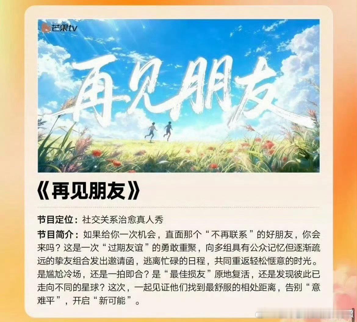 再见朋友真的要来了芒果新一季综艺及晚会片单 2025芒果秋季招商大会再见朋友真的要来了,这的很喜欢这种友情类综艺,我已经狠狠期待住了,快快上映!