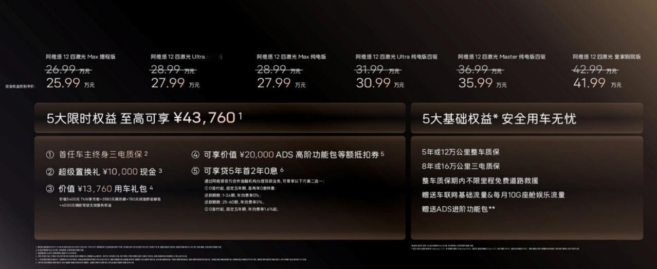 2025年10月28日,智能汽车领域迎来一款重磅力作——阿维塔12四激光版正式上市。新车以26.99万至42.99万元的官方指导价亮相市场,叠加权益后,实际入手价格进一步下探至25.99万至41.99万元区间。发布会现场,华为常务董事、终端BG董事长余承东的现身,无疑为这场新品揭幕增添了更多战略深意,也印证了华为与阿维塔在技术共研与品牌协同上的紧密联结。【来自懂车帝车友圈】