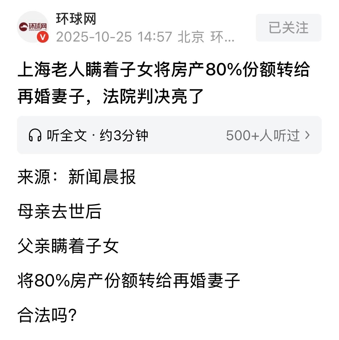 上海,一大爷瞒着4个子女,把和去世妻子共同购买的房子里80%的房产份额,偷偷转给了再婚妻子,自己只留了20%,子女们得知后闹翻了天,觉得肯定是二婚妻子连哄带骗让父亲这么做的,对方根本不把他们几个继承人看在眼里!可再婚妻子却觉得,自己尽心尽力照顾丈夫20年,多分点房产怎么了?四兄妹不顾情面,直接在父亲去世后诉至法院,要求依法继承分割房屋,法院判决亮了。 老张名下的那套老房子,墙皮上还留着孩子们小时候画的涂鸦,阳台晾晒架是亡妻当年亲手装的 ,对四位子女来说,这不仅是房产,更是母亲留下的最后念想。 可母亲去世后,家人没及时办理遗产分割,房子仍登记在老张名下,这份 “拖延”,成了后来矛盾的导火索。 老张再婚后,和新妻子刘女士悄悄办了房产变更登记:原本全归老张的房子,变成他占 20%、刘女士占 80%。 消息传到子女耳中,全家瞬间炸了锅,他们怎么也想不通,母亲留下的份额,怎么突然成了继母的 “大头”? 其实从法律上看,这套房子的性质很明确:它是老张和亡妻的夫妻共同财产,母亲去世后,属于她的 50% 份额,该由老张和四位子女共同继承(每人各占 10%),也就是说,未变更前,老张实际占 60%,子女共占 40%。 而老张和刘女士的变更登记,绕开了子女这四位 “隐性共有人”,这就触及了法律的关键边界。 《民法典》第 209 条虽规定 “不动产登记即生效”,但这不是 “万能挡箭牌”。 比如子女若能拿出证据,证明变更登记时父亲是在昏迷、被胁迫的状态下签的字,或是继母和父亲串通,隐瞒了 “房子有子女继承权” 的事实,法院就可能认定登记无效,把房子份额恢复到合法状态。 具体要找哪些证据?比如去不动产登记中心查当年的申请材料,看有没有子女的签字同意书。 查父亲当时的病历,看是否存在意识不清的情况,甚至可以找邻居作证,证明那段时间父亲身体不好,常被继母 “看管”。 反过来,刘女士也不是没理由,如果她能拿出装修合同、物业费缴费记录,证明婚后出钱翻新了房子。 或是有邻居、护工作证,说她常年照顾老张的饮食起居,法院可能会考虑她的付出,判她获得一定补偿 , 但这和直接占 80% 是两回事,补偿通常是金钱,而非大幅分割房产份额。 老张未经四子女同意,擅自将房屋产权变更登记给现任妻子刘女士,明显侵犯子女合法继承权。 法院审理认定,两人该行为构成 “行为人与相对人恶意串通,损害他人合法权益”,符合民事法律行为无效情形。 对子女来说,维权得按步骤来。 第一步先去不动产登记部门,申请查询当年变更登记的全部材料,看有没有漏洞,比如签名是不是伪造的、申请理由是不是 “赠与” 却没附赠与协议。 第二步把这些材料、母亲的死亡证明、亲属关系证明都整理好,固定成证据。 第三步可以找律师写起诉状,向法院申请确认变更登记无效,同时申请财产保全,防止房子被继母偷偷卖掉。 当然,诉讼不是唯一出路。如果证据不够充分,或者不想把家庭关系闹到无法挽回,子女也可以和继母协商:比如认可继母的部分付出,给她一笔补偿,让她把房产份额恢复到合理比例。 或是约定父亲去世后,房子按法定继承分割,继母在世时可继续居住。 说到底,房产登记虽有法律效力,但绝不是 “错了也不能改”。 对老张的子女来说,关键是抓紧时间找证据,既用法律维护母亲留下的遗产,也尽量给这个已经有裂痕的家庭,留一点沟通的余地 。 综合上述情况,法院最终确认该产权变更行为无效。 对此,你有什么看法呢? 信息来源:环球网