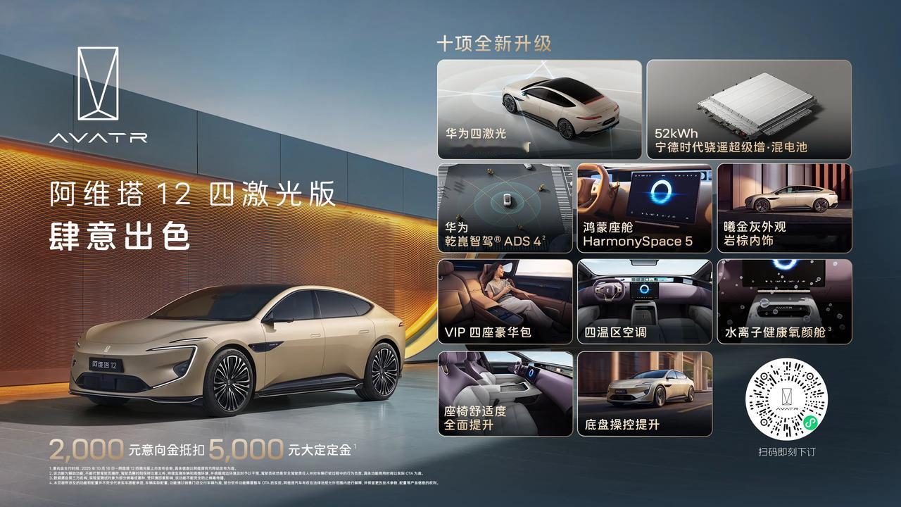 阿维塔12四激光版终于上市啦!不仅价格非常的香,最厉害的还是它用上了华为乾崑智驾ADS 4,在4颗激光雷达的加持下,感知能力特别强,360度无死角,开车更安心,不怕路上的隐形小危险。 从2019年开始,华为与阿维塔就已经开始,在这六年当中,印证了产业共赢的标杆意义。而这次阿维塔12四激光版的正式上市,更是阿维塔与华为深度合作的最好证明,搭载了华为乾崑智驾ADS 4系统,充分展现了华为在智能技术上的顶尖实力。 更有鸿蒙座舱HarmonySpace 5的到来,为阿维塔12四激光版构建起一个真正懂用户的移动智慧空间,总之这车就是把华为的顶级智能科技和新豪华美学都融合进来了,价位和体验都很适合想要高品质生活的人,不得不说华为乾崑智驾ADS 4系统不仅提高了阿维塔12的智能化水平,也是华为与阿维塔深度合作的证明。