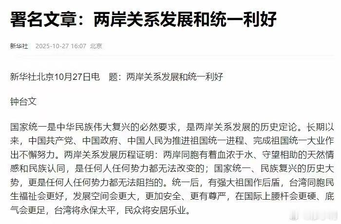 四、2025年10月27日,新华社发布钟台文署名文章《两岸关系发展和统一利好》。