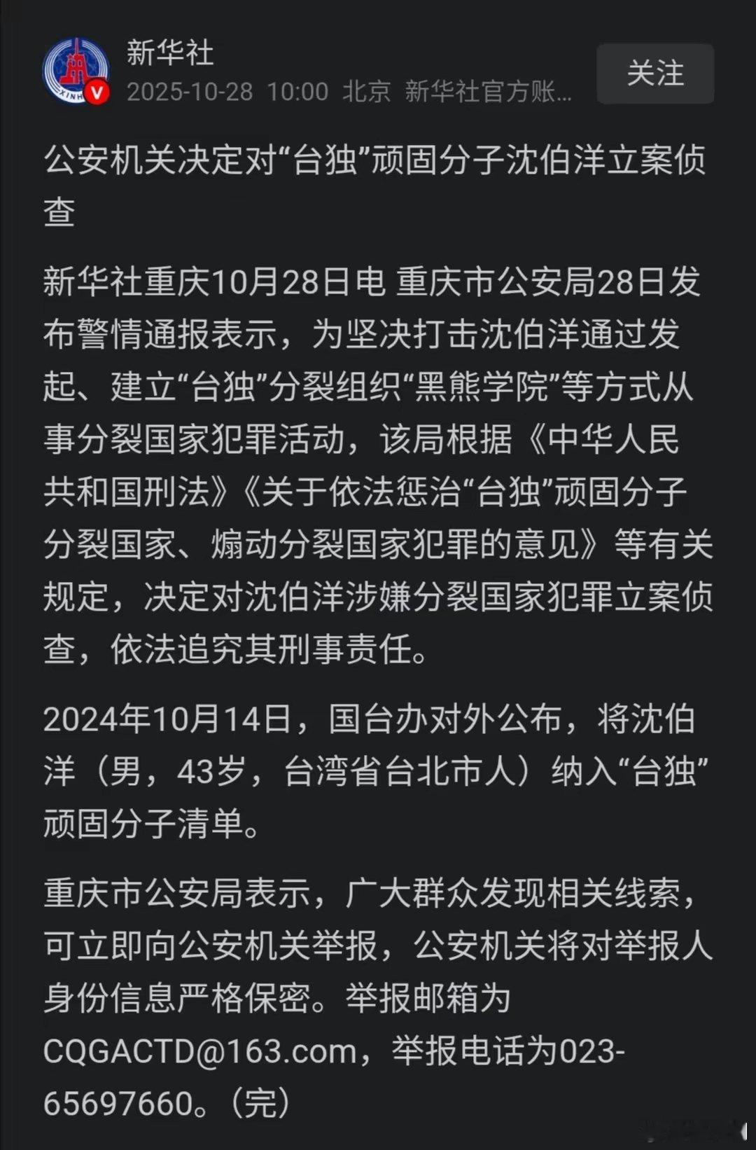 五、2025年10月29日,重庆市公安局宣布对台独分子沈伯洋立案侦查。