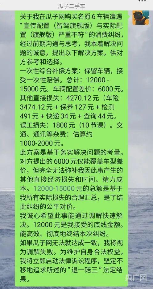 10月17日,李先生对瓜子二手车平台提出保留车辆,并一次性综合补偿12000至15000元的解决方案,以覆盖配置差价、车险、检测费及误工成本。对此,平台答复,在保留车辆的情况下,最多只能按照新车指导价差补偿6000元。