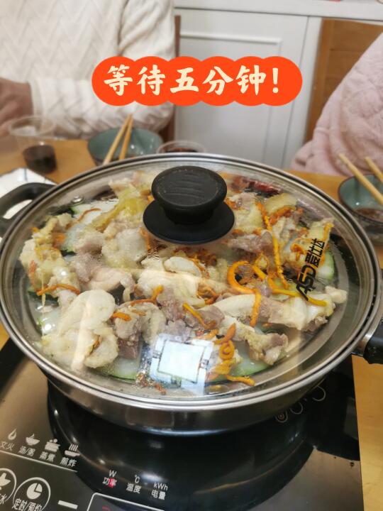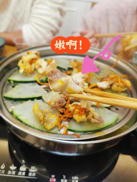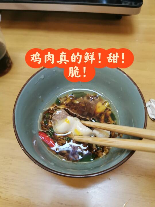 把汤放在电池炉上,汤煲放上蒸盘,垫入冬瓜,把鸡肉铺上蒸盘,盖上盖子,蒸6分钟,开吃!鸡肉刚刚好熟,脆、嫩、滑、鲜。蘸料的话我喜欢蘸辣椒圈酱油。