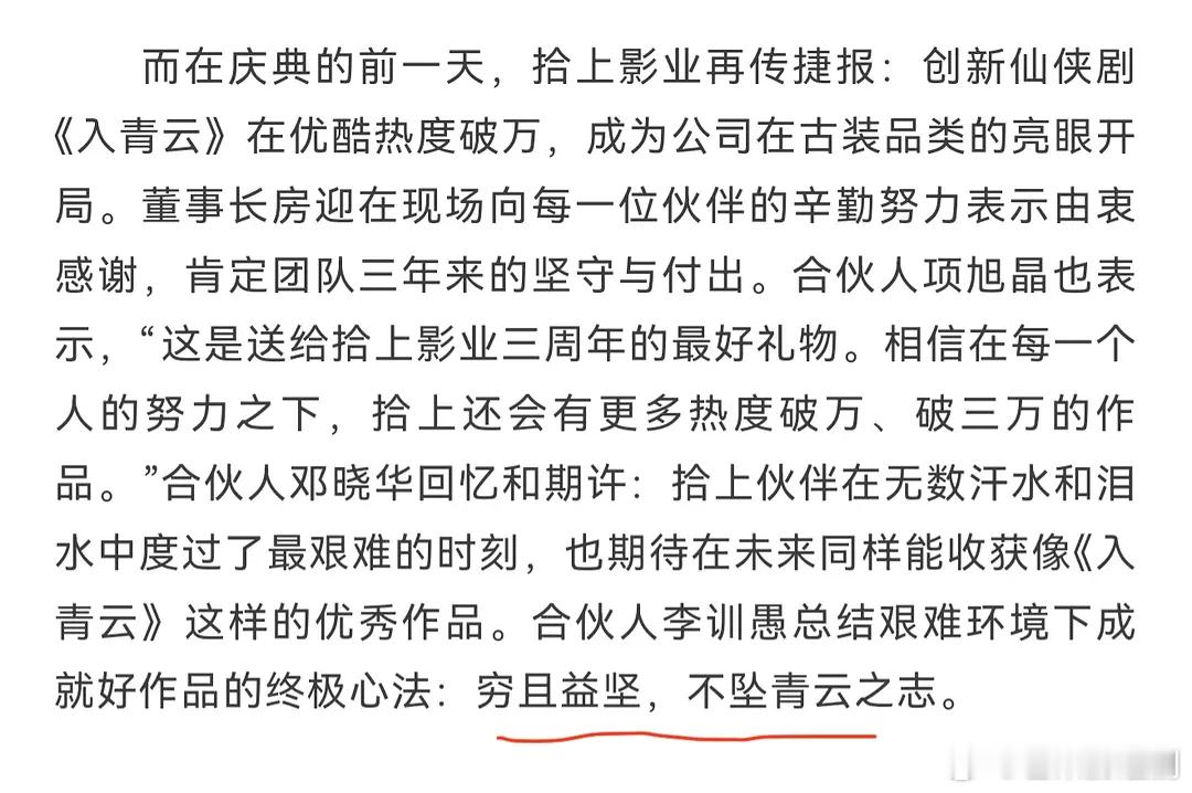 《入青云》的出品公司老板说“穷且益坚,不坠青云之志”,作为侯明昊在优酷第五部破万