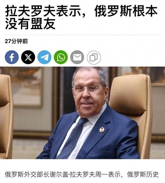 拉夫罗夫:“俄罗斯历史上第一次孤军奋战,对抗整个西方世界。第一次世界大战和第二次世界大战期间,我们都有盟友。现在,我们在战场上没有盟友,这意味着我们必须完全依靠自己。” 一句”孤军奋战”,让74岁的俄国外交老手拉夫罗夫瞬间成了话题中心。这个见过大风大浪的外交部长,为什么要当着朝鲜等支持者的面说自己”没有盟友”?背后到底藏着什么玄机? 2025年7月28日,拉夫罗夫在俄罗斯国家教育青年论坛——Terra Scientia上发表这番言论,一石激起千层浪。这位混了几十年外交圈的老狐狸,为啥要在铁哥们面前装”孤独”? 说起来也有点尴尬,朝鲜在俄乌战争中不仅提供了大量的军事支持,还为俄罗斯付出了实际的代价。朝鲜派遣了大量特种兵参与作战,数以千万计的炮弹、火箭弹也源源不断地提供给俄罗斯。就连西方智库都承认,俄罗斯军队的炮弹近一半来自朝鲜。金正恩更是豪言:“朝鲜人民的骄子视盟国的领土为自己的家园!” 可拉夫罗夫偏偏说自己没盟友,这让朝鲜网友都不干了。朝鲜方面对此表示强烈不满,甚至通过《劳动新闻》发表声明,指出朝俄之间的”血盟”关系不容任何形式的轻视。 拉夫罗夫这话倒也不是完全没道理。看看历史就明白了,在第一次世界大战时,俄罗斯与英法结盟,共同抗击德国;二战时,俄罗斯又和美国、英国并肩作战,对抗纳粹德国,期间获得了大量的物资援助。美国向苏联提供了14000多架飞机、7000多辆坦克、3000万吨粮食等海量物资,那叫真正的盟友支援。 现在呢?情况确实不太一样。俄罗斯表面上对乌克兰宣战,但我们都知道,乌克兰背后有北约32个国家撑腰。美国提供F-16战机,英国提供导弹,德国和法国则提供情报支持。拉夫罗夫特别强调,随着西方盟国继续向基辅提供军事援助,美国、英国和其他国家”正在与我们直接交战”。 有意思的是,拉夫罗夫的这番话可能还有更深层的意思。至于中国,虽然拉夫罗夫没有直接提到,但他的言辞中似乎隐含着一些不满。自俄乌冲突爆发以来,中国一直保持中立立场。中国确实在经济上支持俄罗斯,但在军事援助方面比较谨慎,这可能让拉夫罗夫觉得还不够给力。 这位外交老手的话背后,其实透露着俄罗斯当前的真实处境。俄罗斯的依赖关系也引发了外界的关注。虽然与伊朗、朝鲜和中国的关系日益紧密,但这些国家的支持仍然不能与二战时期的盟友相比。 有分析认为,这句话或许反映了俄罗斯高层内心的一种真实看法——即便签了条约、接受了援助,他们仍然不认为这些支持能构成真正的”盟友”。在俄国人眼里,盟友得是那种能够提供全面支持、共同承担风险的伙伴,不是只在边上帮帮忙的关系。 从另一个角度看,拉夫罗夫这番话可能也是一种政治策略。从内部角度看,他可能希望激发民众的民族情感,让他们意识到国家正面临严峻的挑战,增强凝聚力。毕竟,“孤军奋战”比”靠人帮忙”听起来更有骨气一些。 不过说实话,俄罗斯现在的情况确实有点微妙。经济上受制裁,军事上压力大,外交上也不太好过。虽然普京依然掌握着几张”王牌”,比如通过影子舰队将石油倒手后卖给其他国家,避免西方的制裁,但这些策略面临着巨大的成本和风险。 拉夫罗夫的感慨虽然有点伤朝鲜朋友的心,但从大的战略格局来看,倒也反映了一些现实。现在的国际关系跟以前确实不一样了,大家都有自己的算盘,很难找到那种生死与共的铁杆盟友了。 拉夫罗夫这句”史无前例的孤军奋战”到底是真情流露还是外交策略?俄罗斯能否在没有传统意义盟友的情况下打赢这场持久战?你觉得现在的国际关系中,还存在真正的”铁杆盟友”吗?欢迎在评论区说说你的看法。