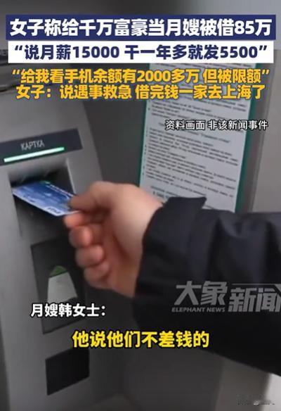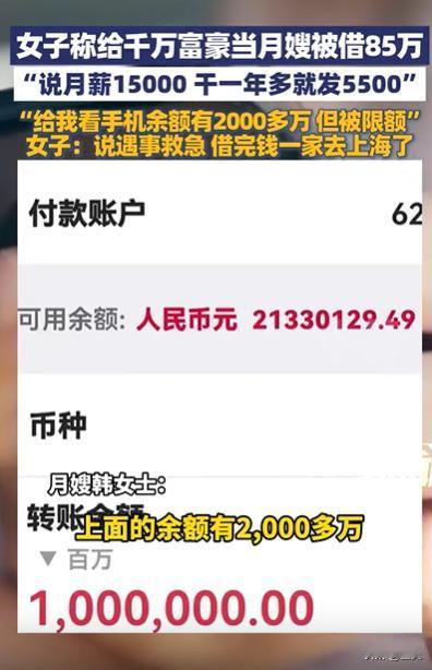 10月22日,浙江湖州,女子给千万富豪当月嫂,月薪15000元,她还以为遇到了大雇主,结果,她干了1年多,却只收到5500元工资,不仅工资没收到,还反被雇主借走85万。[大侦探皮卡丘] 郑州的韩女士通过月子中心接了一份工作,去浙江湖州给一户人家当月嫂,说好月薪一万五。 谁能想到,干了一年多,她不但没拿到工资,还倒贴进去85万,现在负债累累。 去年8月,韩女士到雇主家上班没多久,到了该发工资的日子,雇主家孩子的奶奶开始找她聊天,说家里遇到点麻烦。 男朋友在上海因为消费问题被调查,需要交保证金,能不能先借点钱应急。 为了打消韩女士的顾虑,对方还专门给她看了手机上的银行卡余额,显示有2100多万。 说他们不缺钱,就是卡有限额一时取不出来,过两天就还,韩女士当时想着,人家家底这么厚,应该问题不大。 就这样,从去年8月到今年10月,雇主一家不断以各种理由找韩女士借钱。 开始是交保证金,后来又说要卖路虎车需要过户费,每次都是十几万地要。 韩女士自己的积蓄很快用光,在雇主的“指导”下,她开始找亲戚朋友借,甚至办了网贷。 转折点出现在韩女士无意中跟小区物业聊天时,物业告诉她,雇主住的这套“豪宅”其实是租来的,一个月租金好几万。 这时候韩女士才反应过来不对劲,但钱已经借出去85万了。 今年6月,雇主一家说要去上海办事,走了之后就失去了联系。 韩女士等了数月,实在等不下去,选择了报警。 雇主后来现身,倒是承认借钱的事,还写了张84万的欠条,但只象征性地还了1万块钱。 其实仔细想想,破绽挺明显的,真正有钱的人家,遇到急事会向自己的亲戚朋友、银行借钱,怎么可能找一个刚来不久的月嫂开口?这本身就很反常。 韩女士的案子现在还在调查,那张84万的欠条能不能兑现还是未知数。 即便将来能追回部分钱款,她身上的网贷和欠亲友的债也够她还很久了,一时的轻信,换来的可能是多年的困境。 天上真的不会掉馅饼,越是看起来轻松的高薪机会,越要多留个心眼。 保护好自己的钱袋子,远比追求所谓的“好机会”重要得多。 网友评论: “这分明就是诈骗,太缺德了!” “不发工资还倒借走85万?这月嫂也太好说话了。” “一看就是套路,豪宅是租的,余额截图怕是P的吧!” “私单接不得!家政人员一定要走正规公司!” “月嫂行业若没有正规公司作为后盾,最好别做。尤其是私下接单的,仅凭口头承诺,连一纸劳动合同都没有,风险极大!”  “高薪诱惑是陷阱,守住钱袋子最重要。” 如果你在工作中遇到雇主或同事向你展示“雄厚财力”后开口借钱,你会怎么做? 有什么好方法能既不得罪人,又能稳妥地保护自己吗?欢迎在评论区分享你的高招或见解! 信源:大象新闻