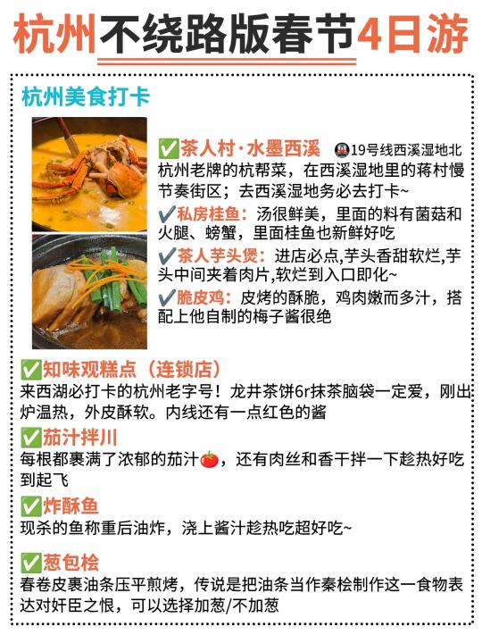杭州4天3晚旅游详细路线攻略 纯干货 . 本土著都给大家把路线整理出来好啦,去杭州玩根本不担心会绕路!!希望对你们🈶帮助~ . 🎈市外交通 ✈机场:萧山机场,有地铁直达景区 🚅高铁:推荐杭州东站、杭州站,都在主城区,离景区近,杭州站去西湖打个车10分钟就到了 . 🍛杭州吃喝 🍜茶人村·水墨西溪 🍜知味观糕点 🍜茄汁拌川 🍜炸酥鱼 🍜葱包桧 .