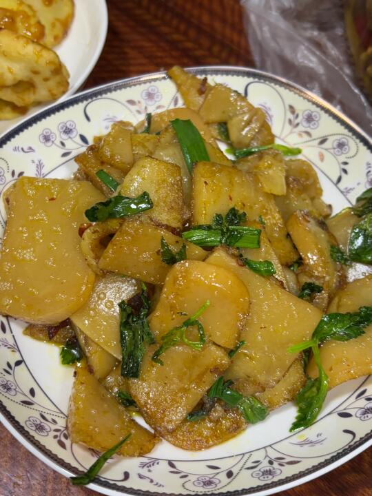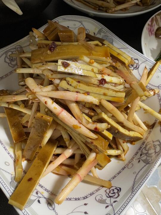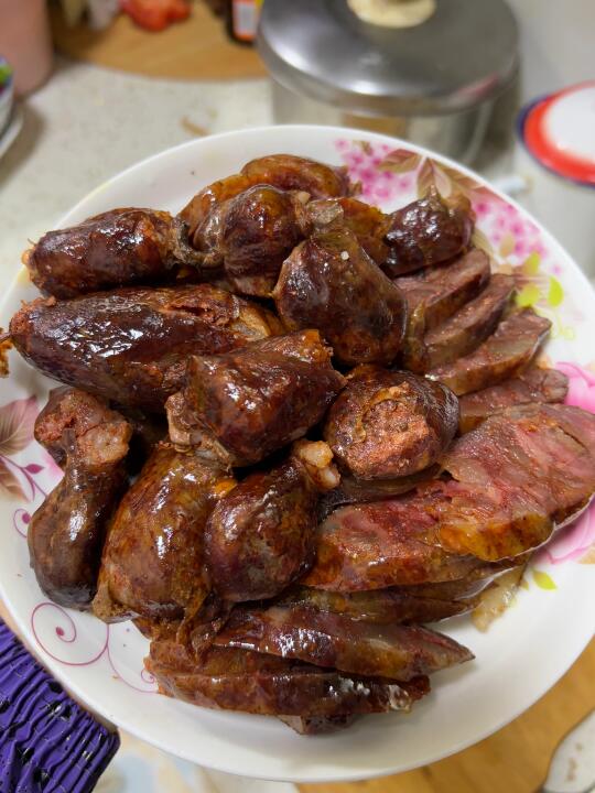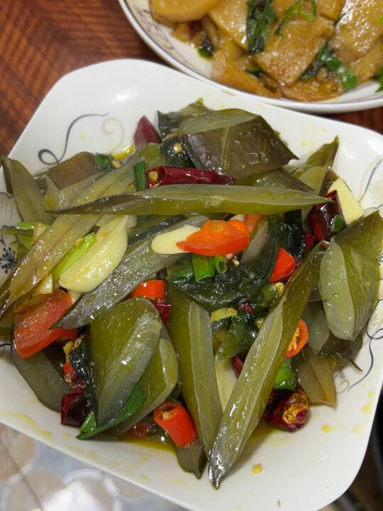 今天桌子上的菜品有: 青椒木耳炒猪肉丝 爆炒海白菜 腊香肠腊肉 芹菜叶炒米豆腐 蒸糯米肠 油炸糯米粑粑 爆炒牛筋 凉拌卤豆干折耳根 凉拌猪耳朵 凉拌大头菜 煲玉米莴笋鸡汤 煮酥肉汤