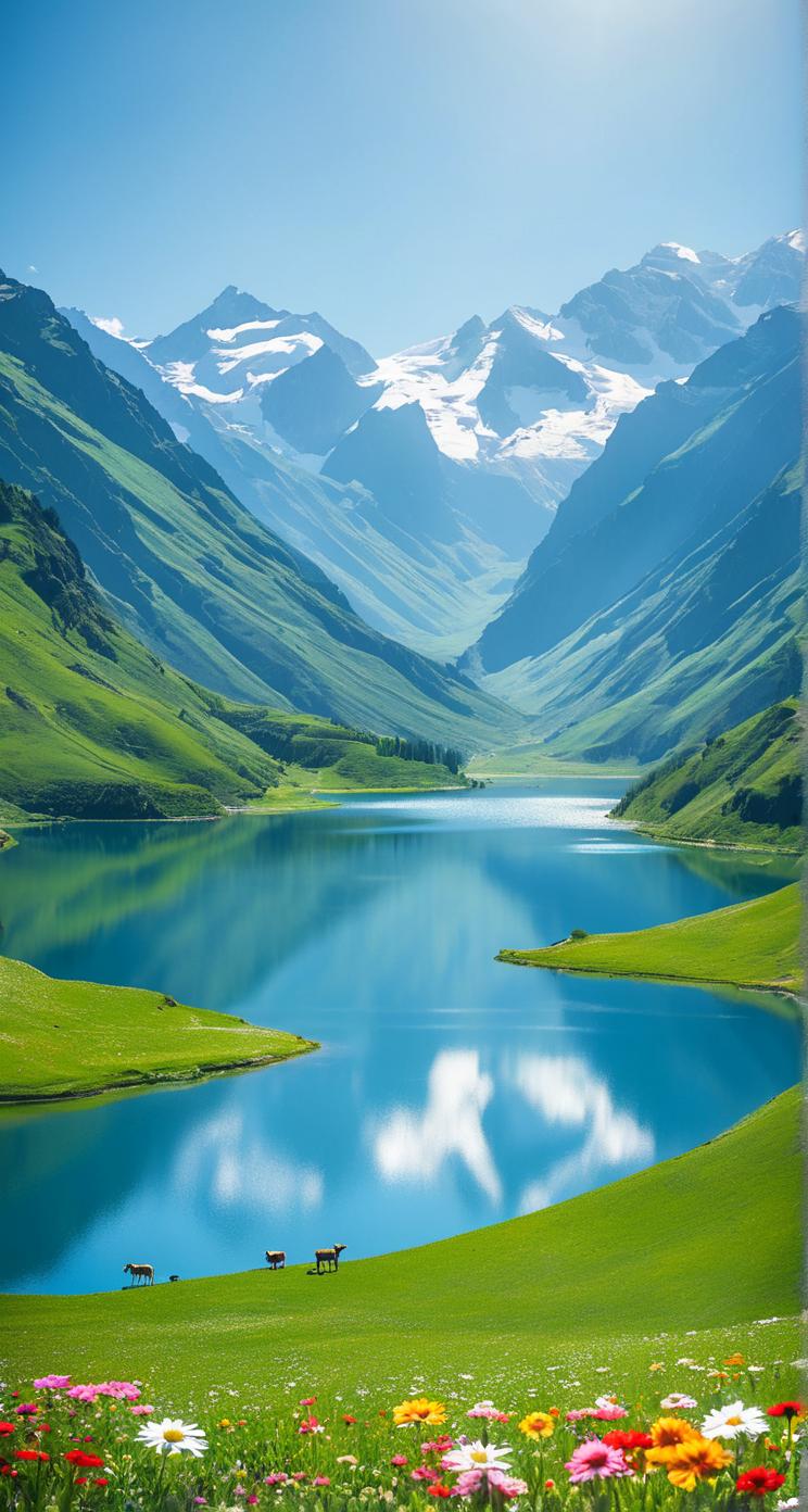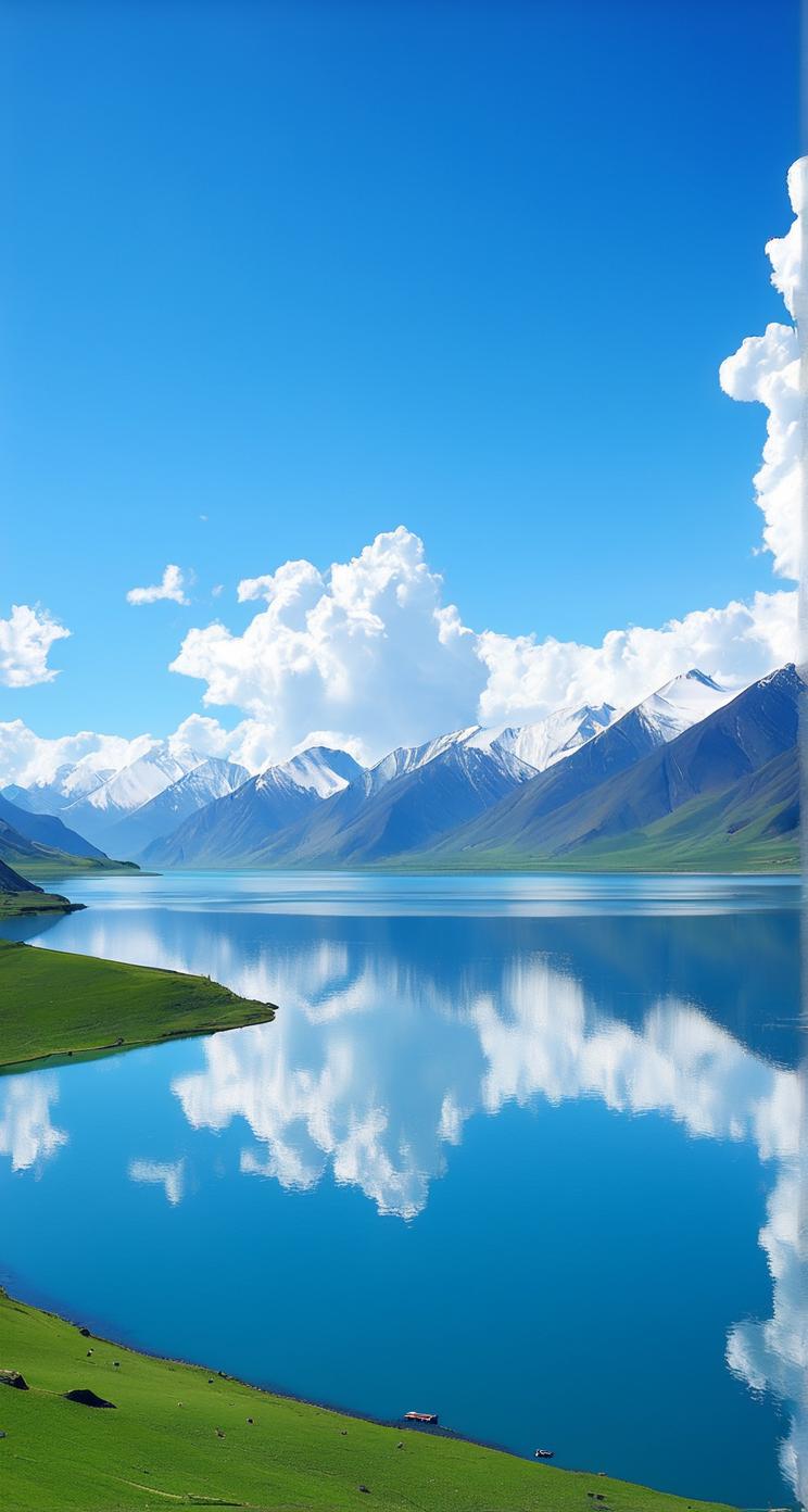 一片辽阔的湖面,湖水如同一面镜子,倒映着远处巍峨的雪山和蓝天白云。湖边是郁郁葱葱