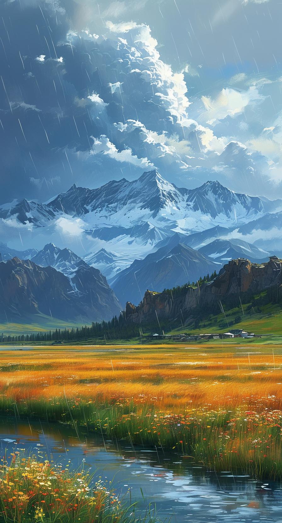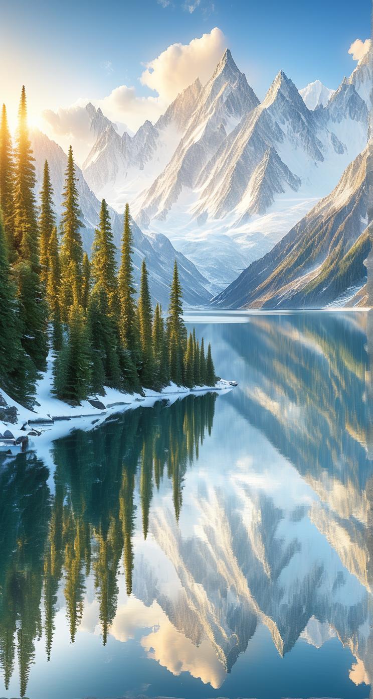 一片辽阔的湖面,湖水如同一面镜子,倒映着远处巍峨的雪山和蓝天白云。湖边是郁郁葱葱的森林,树叶在微风中轻轻摇曳,阳光穿过树梢,洒下一片金色的光晕。远处的山峰被云雾缭绕,宛如仙境一般宁静而神秘。 希望这个描述能带给你一份美的享受!如果你喜欢,我也可以帮你推荐一些著名的风景照片或景点。