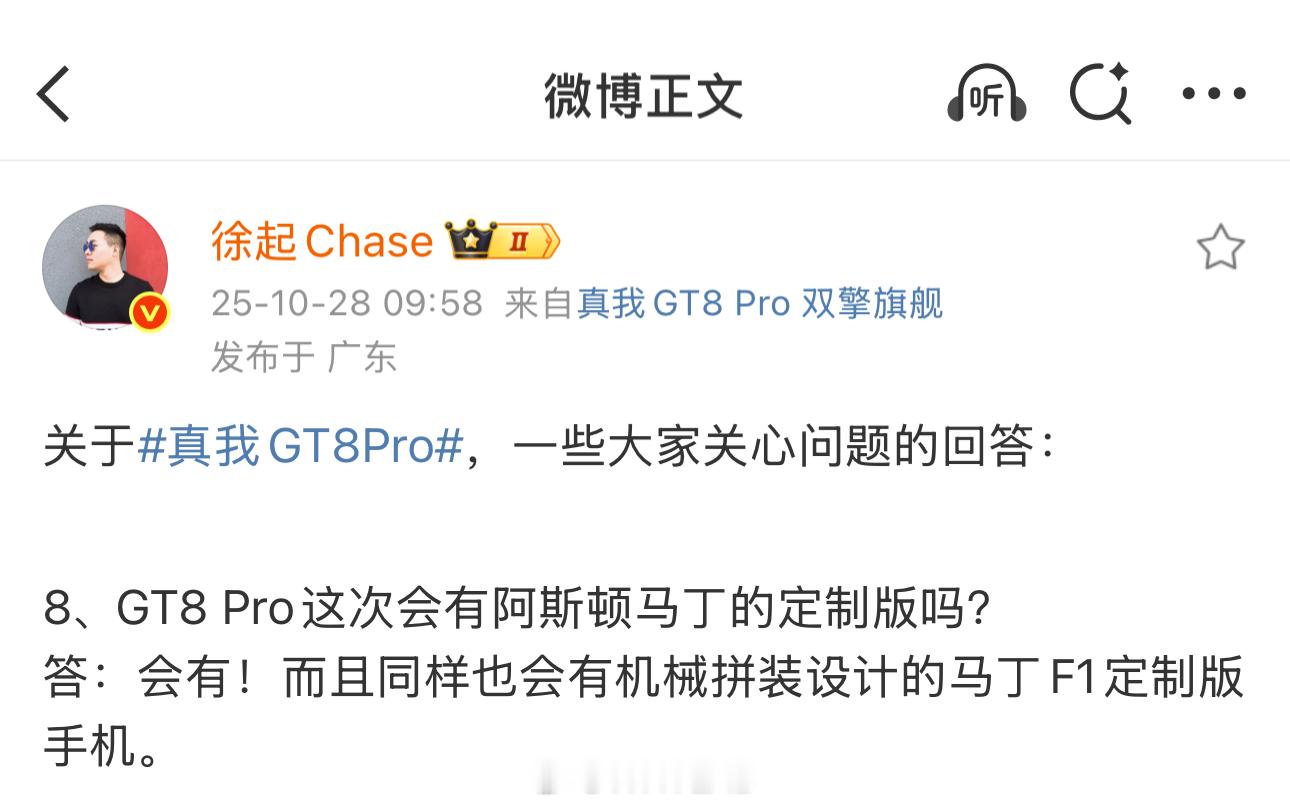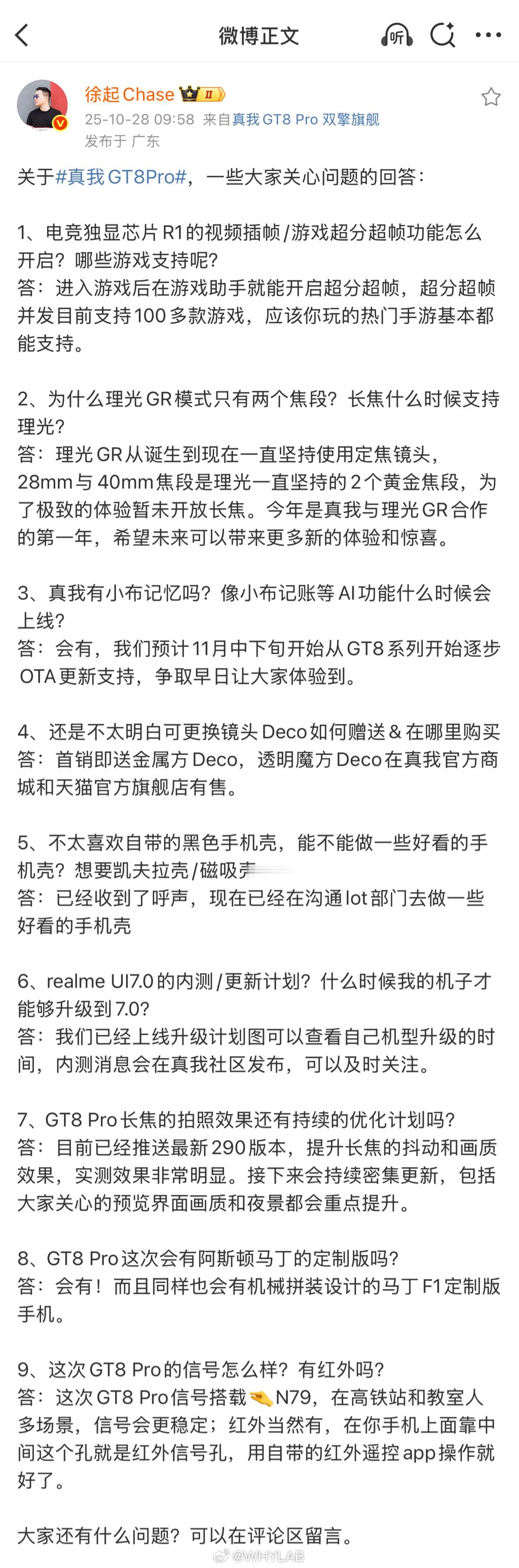 徐起:真我 GT8 系列预计在 11 月中下旬 OTA 支持小布记忆、小布记帐等 AI 功能;真我 GT8 Pro 将会在 11 月推出支持机械拼装设计的阿斯顿马丁 F1 定制版手机。[并不简单]