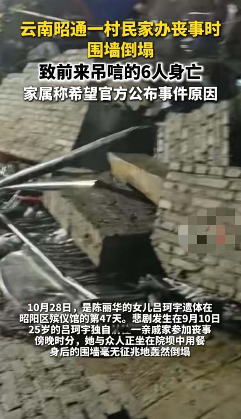 云南昭通一村民家办丧事时,围墙倒塌,前来吊唁的6人被压身亡,这就是所谓的陪葬吗? 家属称希望官方公布事件原因,看了通报,借用邻居家的院子,然后下雨拉了塑料布,塑料篷布兜水太沉把砖墙拉倒了。记得那天晚上打了好大的雷,雨下的很大,去吊唁 一桌人吃饭,好像还没有开吃,刚好坐在拉雨布墙边,一面墙倒塌了。科学永远不可能探索到宇宙全部,最多40%就相当可以了