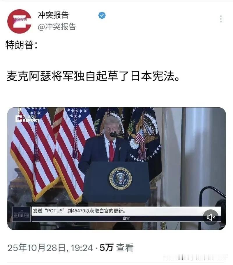 特朗普昨天(10月28日)在日本表示,当年麦克阿瑟将军独自起草了日本宪法。 10月28日,特朗普在日本抛出的一番言论令人大跌眼镜——他公然宣称,当年的日本宪法是麦克阿瑟将军独自起草而成。 这番话看似斩钉截铁,实则与历史真相相去甚远,暴露的不仅是对史实的无知,更是对历史严肃性的漠视。 “以史为鉴,可以知兴替”,历史从来不是任人随意涂抹的画布,每一个细节都有迹可循。 麦克阿瑟在日本宪法的诞生过程中确实扮演了关键角色,主导了核心原则的定调,但要说“独自起草”,无异于痴人说梦。 当时,麦克阿瑟的团队仅用7天时间就搭建起宪法草案的基本框架,这样仓促的速度本身就注定了草案不可能完美无缺,更不可能仅凭一人之力完成。 真正让日本宪法得以成型、具备可执行性的,是日本本土法律专家后续付出的大量心血,他们逐字逐句修订打磨,弥补漏洞、细化条款。 让这部宪法既兼顾了当时的国际局势,也贴合了日本的社会实际。特朗普口中的“独自起草”,完全无视了日本法律界人士的贡献,更掩盖了背后美军强压的历史背景。 二战结束后,日本处于美军占领之下,麦克阿瑟主导的宪法草案本质上是占领当局意志的体现,日本方面虽有修订权,却始终在美军的强势主导下进行妥协。 所谓“独自起草”的说法,不过是将霸权逻辑包装成个人功绩,既歪曲了麦克阿瑟的历史角色,也贬低了日本在宪法制定中的参与度,这样的言论怎能不让熟悉历史的人感到荒谬? 历史认知的偏差往往会引发连锁反应,作为美国总统,特朗普的公开言论具有广泛的影响力,如此轻率地歪曲史实,不仅误导了公众,更消解了历史的严肃性。 试想,如果连重要历史事件的基本脉络都能被随意篡改,那我们还能从历史中汲取什么经验教训?日本宪法的制定过程,是二战后国际秩序重构的一个缩影。 既包含了战胜国的主导作用,也有战败国的被动适应与主动调整,每一个参与方的角色都不该被抹杀或歪曲。 麦克阿瑟的团队搭建框架是事实,日本专家修订完善是事实,美军强压下的妥协也是事实。这三个环节环环相扣,才促成了日本宪法的最终诞生。 特朗普刻意忽略后两个关键环节,片面夸大“独自起草”的说法,本质上是对历史复杂性的简化,更是对历史真相的不尊重。 这种将复杂历史事件简单化、个人化的言论,不仅不符合史实,更会传递错误的历史观,让不明真相的人对这段历史产生误解。 历史不容篡改,真相不容歪曲。每一个对历史抱有敬畏之心的人,都应尊重历史的本来面貌,拒绝被片面言论误导。 特朗普此番失实言论,既是其历史认知匮乏的体现,也提醒我们,在信息繁杂的当下,更要保持独立思考,多查阅权威资料,树立正确的历史观。 唯有尊重历史真相,才能从历史中获得真正的启示,避免重蹈覆辙。这或许就是这段小插曲带给我们最深刻的教训。