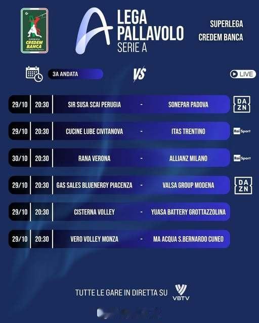 【意超男排本轮赛程对阵】国际排坛动态 10月29-30日,意超男排将展开第三轮争夺。本轮焦点战是北京时间30日凌晨3:30,奇维塔诺瓦主场与特伦蒂诺的强强对话。图中时间+7小时为北京时间。