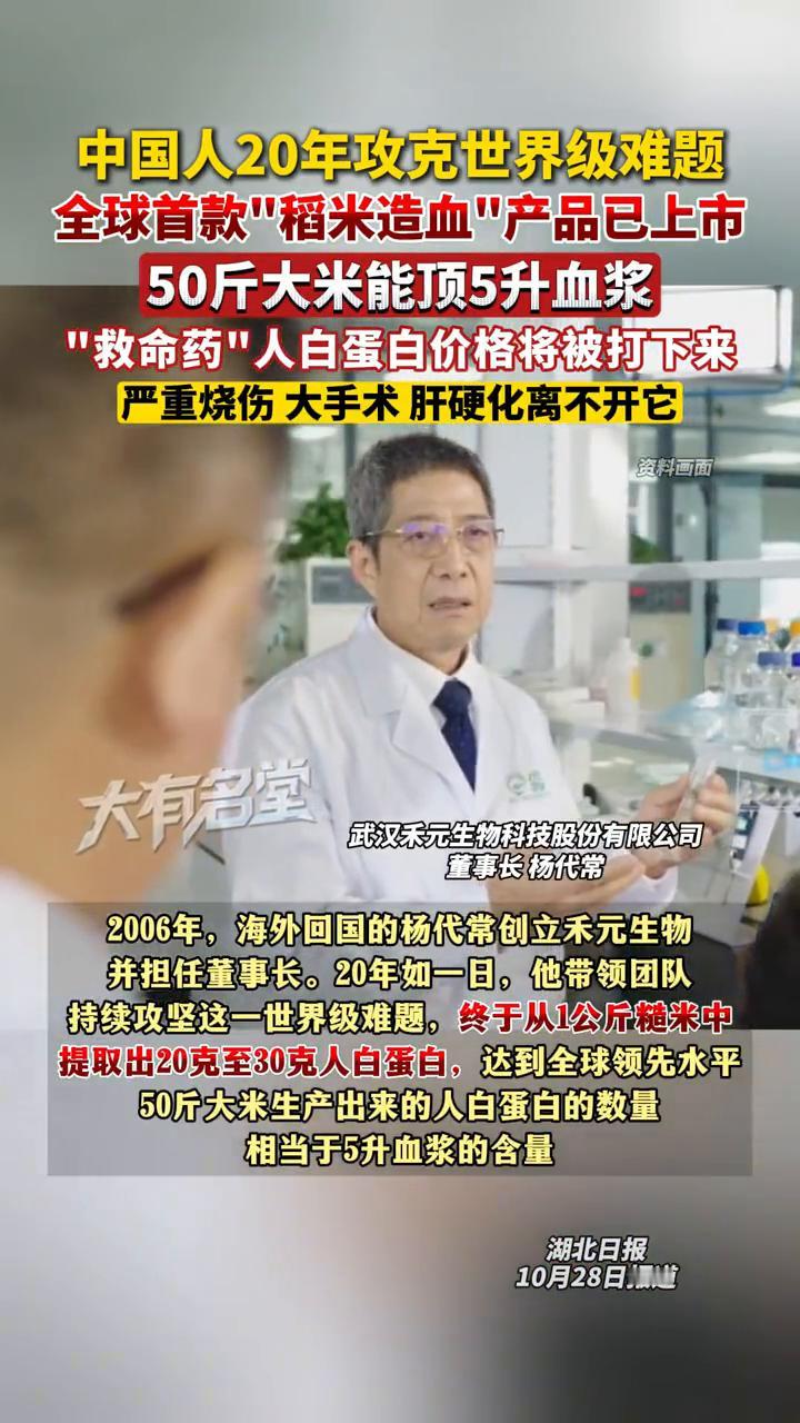 中国人20年攻克世界级难题,全球首款"稻米造血"产品已上市,50斤大米能顶5升血浆,"救命药"人白蛋白价格将被打下来,严重烧伤、大手术、肝硬化离不开它。 湖北日报。 2025年7月18日,武汉禾元生物科技股份有限公司自主研发的重组人白蛋白注射液(水稻)获得国家药品监督管理局批准上市,成为全球首个"稻米造血"一类创新药。 "稻米造血"是将人白蛋白基因植入水稻,使水稻在生长过程中合成人白蛋白,并通过提取、纯化等工艺制成注射液。人白蛋白被称为"黄金救命药",当遭遇严重烧伤、大手术或肝硬化等疾病时需要注射它来维持生命体征。但长期以来,它只能从人血浆中提取,产量有限,我国60%以上依赖进口。 目前,一瓶50克装的人白蛋白售价400多元,严重肝硬化患者一周要用3至5瓶,一个月支出近万元。 2006年,海外回国的杨代常创立禾元生物并担任董事长。20年如一日,他带领团队持续攻坚这一世界级难题,终于从1公斤糙米中提取出20克至30克人白蛋白,达到全球领先水平。50斤大米生产出来的人白蛋白的数量相当于5升血浆的含量。 杨代常表示,产品规模化生产后还有望解决我国长期依赖进口的局面。禾元生物已建成符合国际标准的智能化生产线,可年产1200万瓶重组人白蛋白注射液。