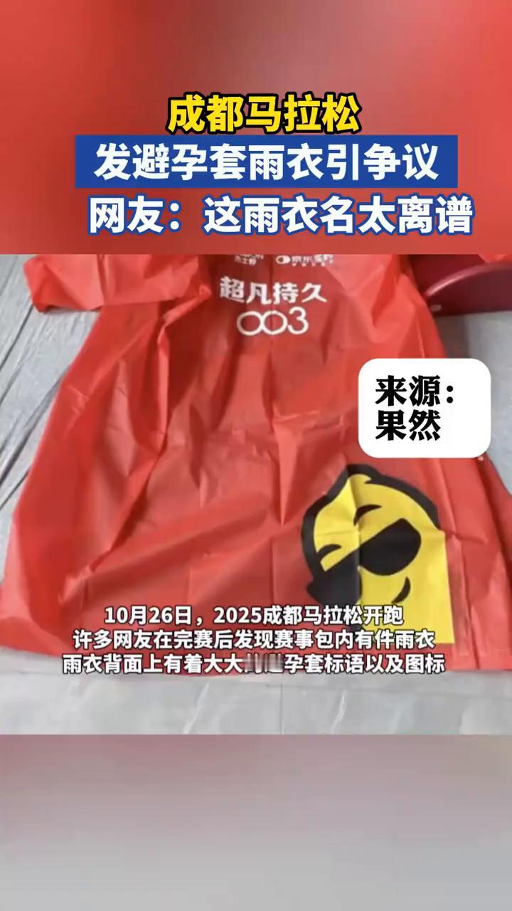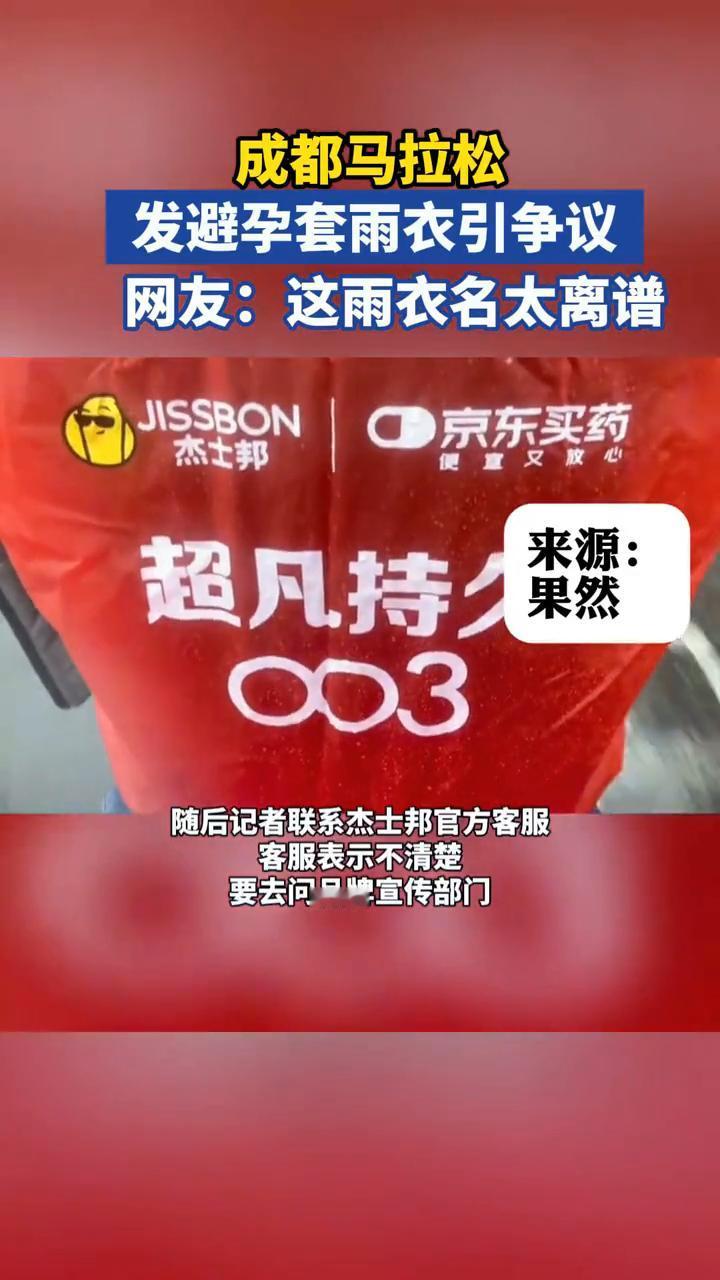 成都马拉松发避孕套雨衣引争议。网友:这雨衣名太离谱。 果然视频。 10月26日,2025成都马拉松开跑。许多网友在完赛后发现赛事包内有件雨衣,雨衣背面上有着大大的避孕套标语以及图标。雨衣画面显示广告标语"超凡持久003",以及巨大的图标。网友纷纷在网上晒出了他们发的雨衣,纷纷吐槽:"咱就是说这玩意谁穿的出去?" 10月28日10时,记者联系到成都马拉松赛事主办方,主办方表示:"雨衣是由杰士邦赞助的。"对于这种广告标语是否有考量,工作人员表示:他们并不清楚。随后记者联系杰士邦官方客服,客服表示不清楚,要去问品牌宣传部门。