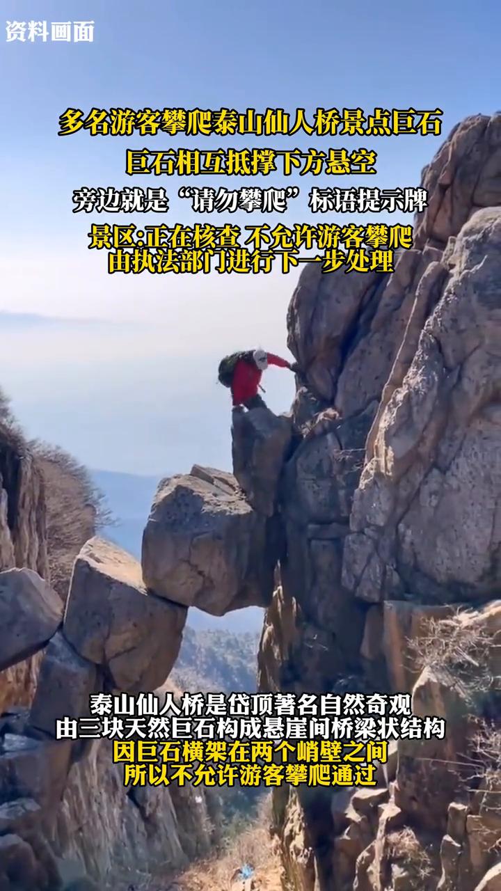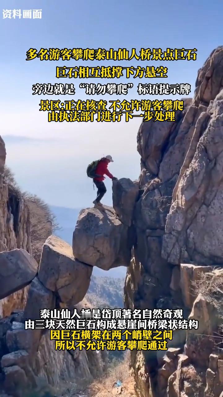 多名游客攀爬泰山仙人桥景点巨石,巨石相互抵撑下方悬空,旁边就是"请勿攀爬"标语提示牌。景区:正在核查不允许游客攀爬,由执法部门进行下一步处理。 10月28日有游客发视频说,该景点下方有景区设立的"请勿攀爬危险止步"标语提示牌。泰山仙人桥是岱顶著名自然奇观,正在根据视频内容进行核查。由三块天然巨石构成悬崖间桥梁状结构,因巨石横架在两个峭壁之间,所以不允许游客攀爬通过。 该工作人员表示:已把相关情况和视频以及发视频游客账号反馈给管理区执法部门来进行下一步处理。