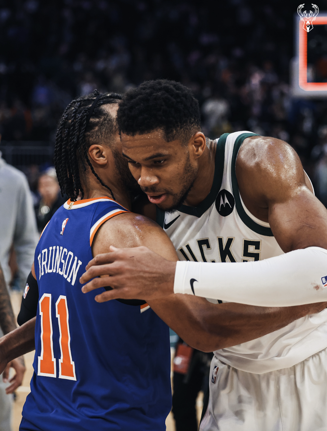 赛后雄鹿官媒更新了X晒出了杰伦-布伦森与扬尼斯-阿德托昆博的赛场照。