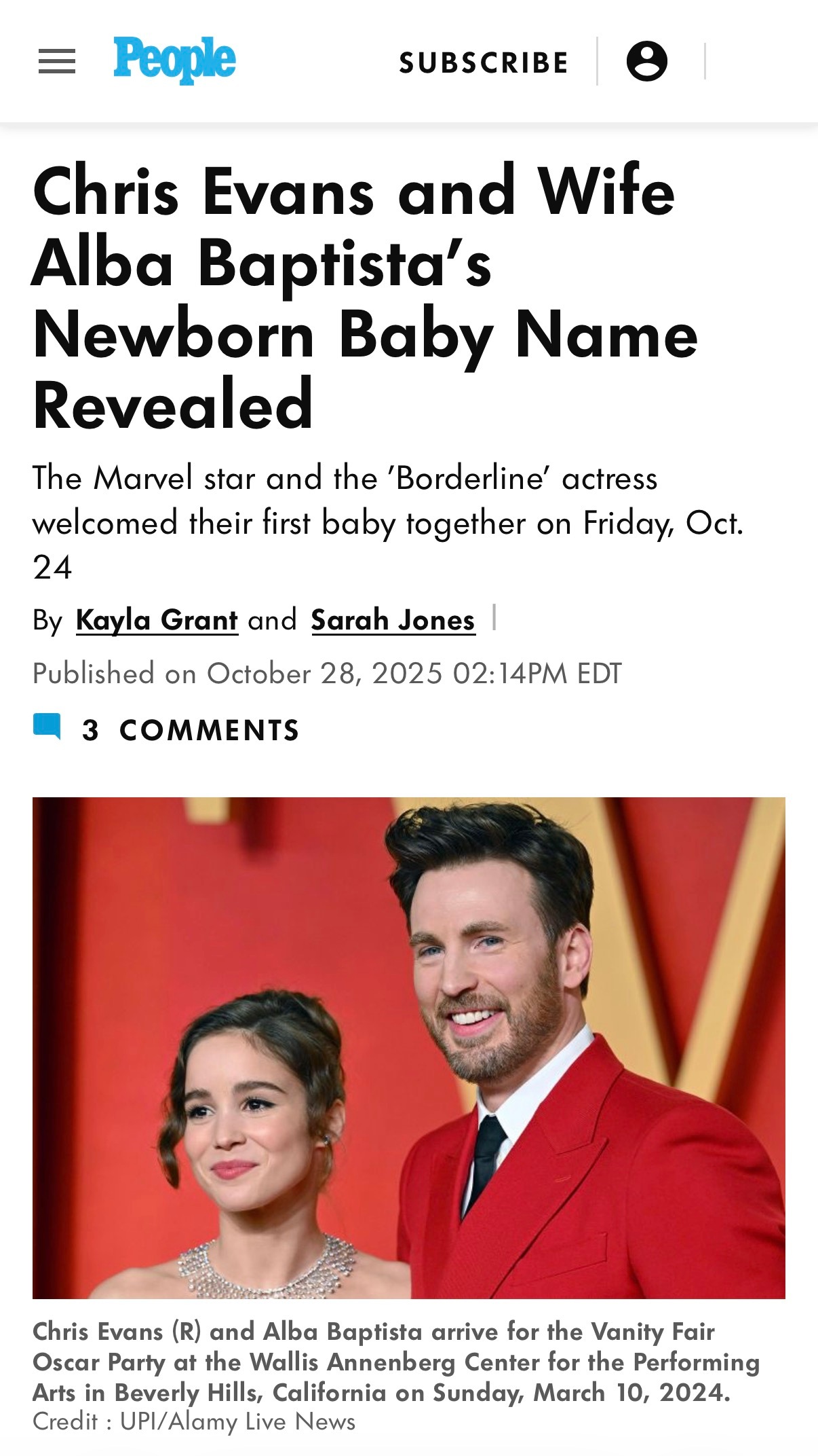 【美国队长升级美国奶爸】美国队长演员迎来第一个孩子据外媒报道,美国队长演员克里斯·埃文斯和妻子迎来了他们的第一个孩子,并为孩子取名为阿尔玛·格蕾丝·巴普蒂斯塔·埃文斯。这对夫妻于2022年1月相识,并于2023年9月正式结为夫妻。